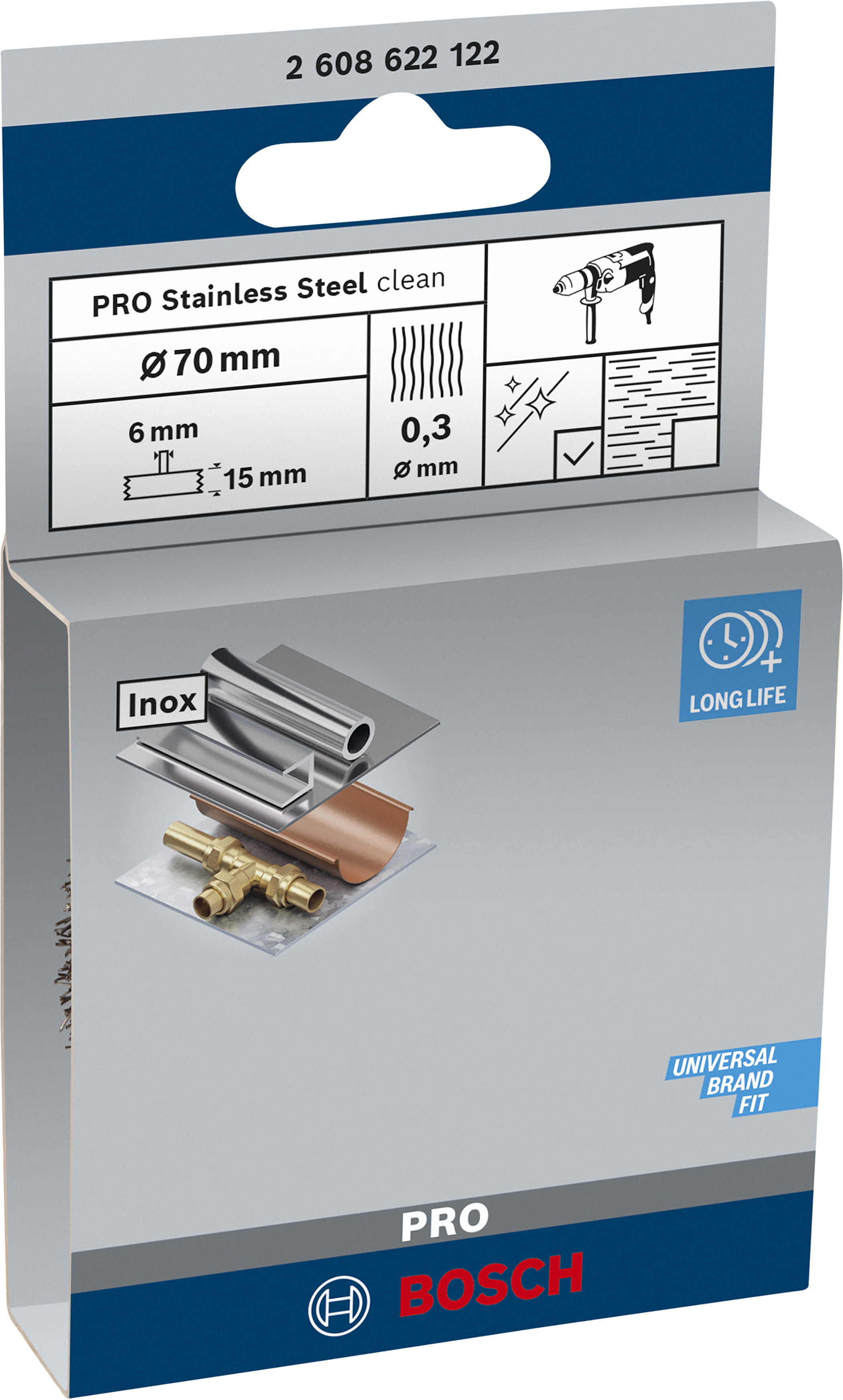 Emballage: 1Marque: BoschRéférence: 2608622122EAN: 3165140632027Description: Brosse circulaire PRO pour l'Inox pour perceuse 70x0.3 mm