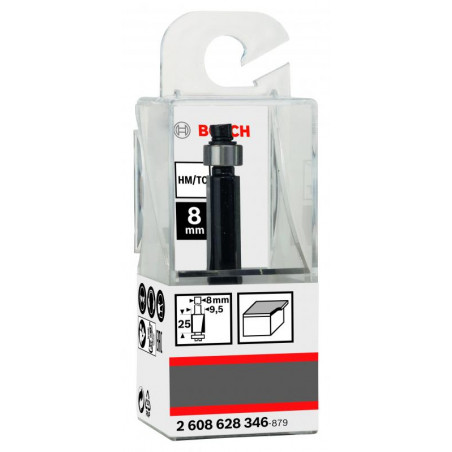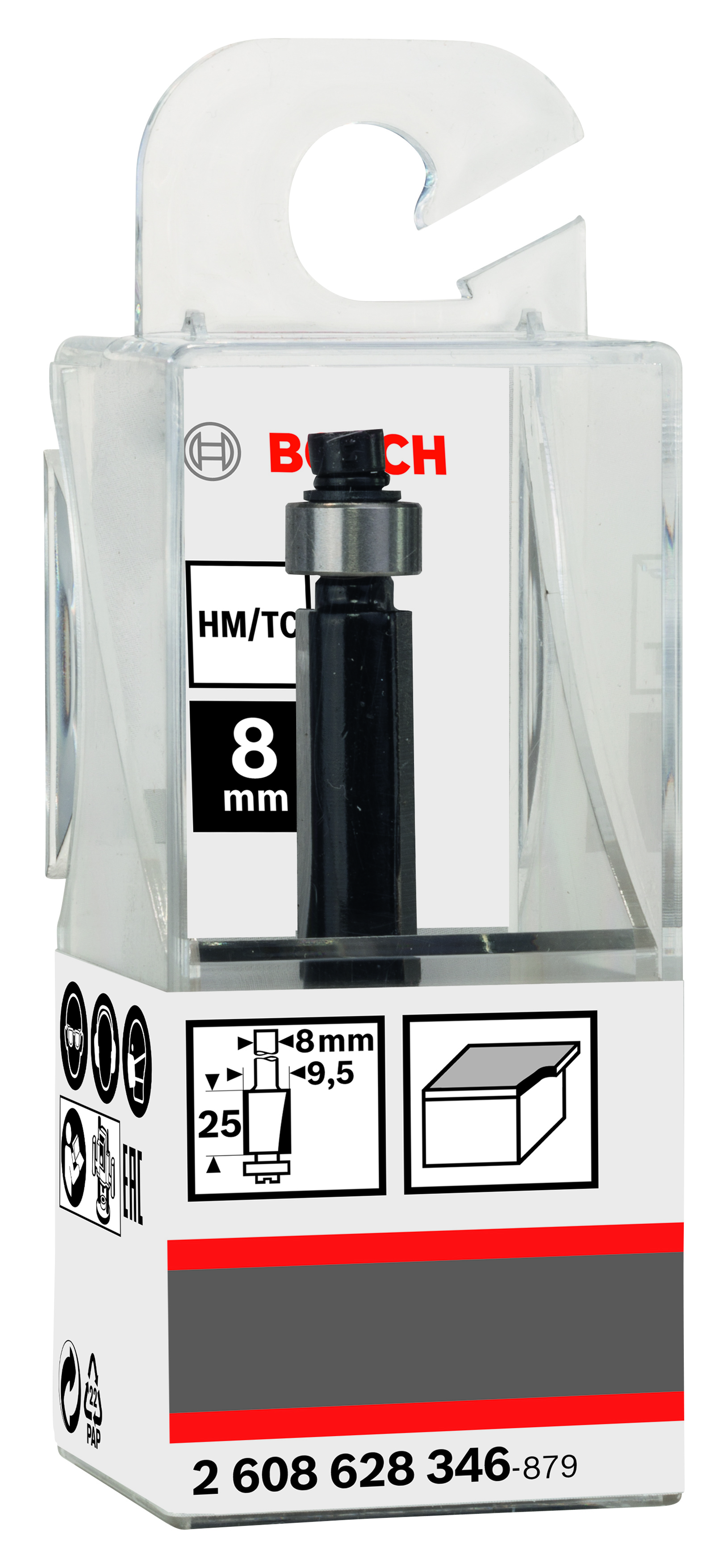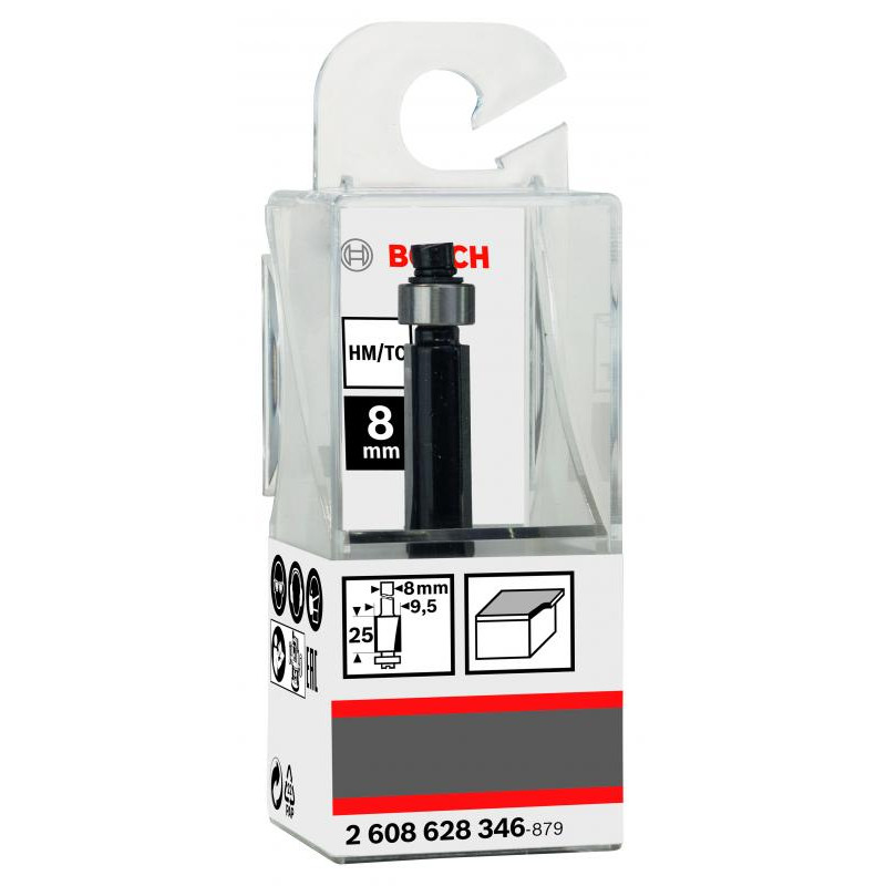 Emballage: 1Marque: BoschRéférence: 2608628346EAN: 3165140358071Description: Fraise à araser 8 mm, D1 9,5 mm, L 25,4 mm, G 68 mm
