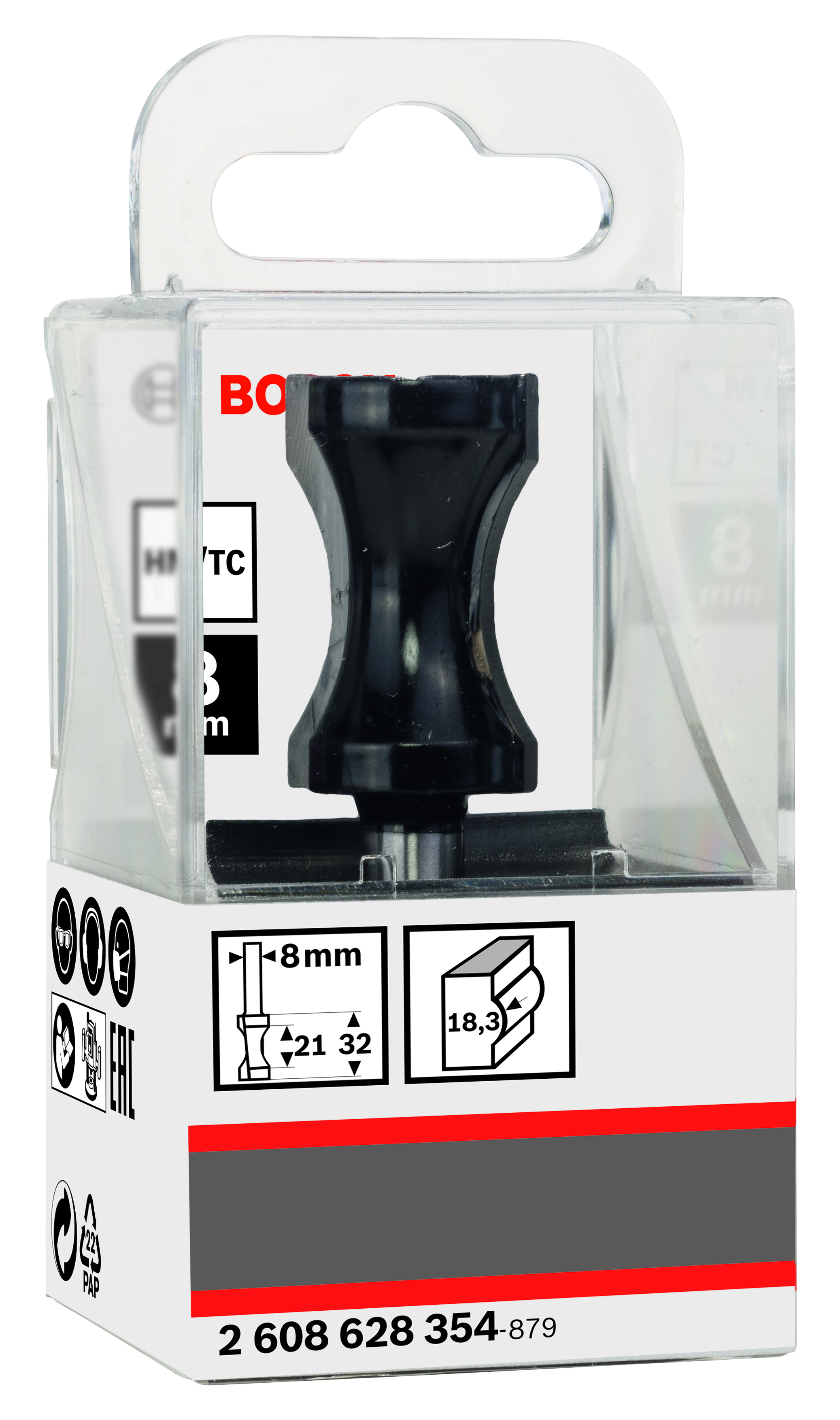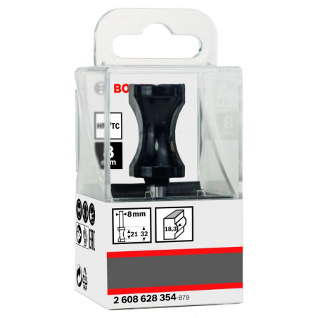 Emballage: 1 Marque: Bosch Référence: 2608628354 EAN: 3165140358156 Description: Fraise à moulurer plein rond 8 mm, R1 18,3 mm, D 20,6 mm, L 32 mm, G 63,5 mm