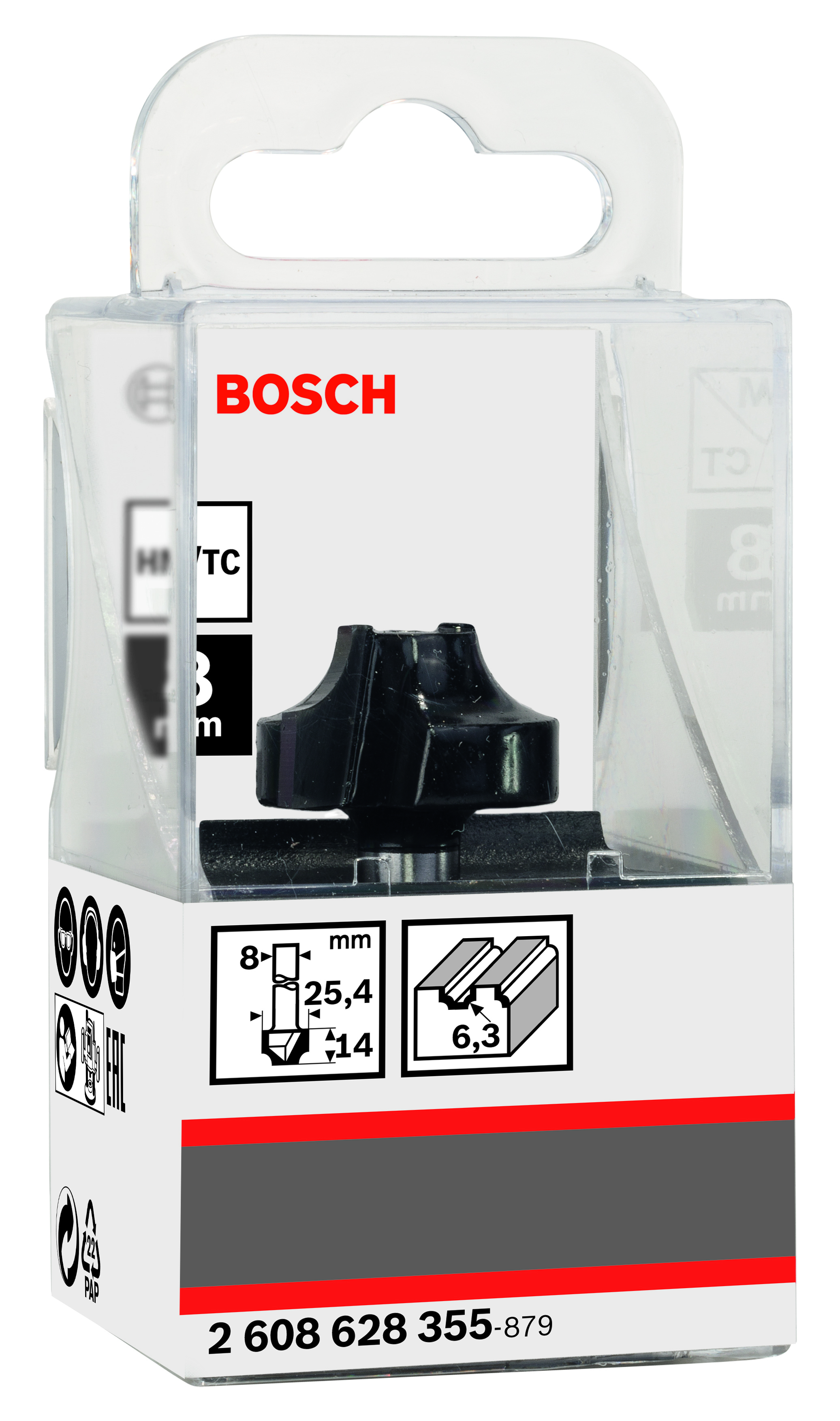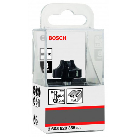 Emballage: 1Marque: BoschRéférence: 2608628355EAN: 3165140358163Description: Fraise à profiler E 8 mm, R1 6,3 mm, D 25,4 mm, L 14 mm, G 46 mm