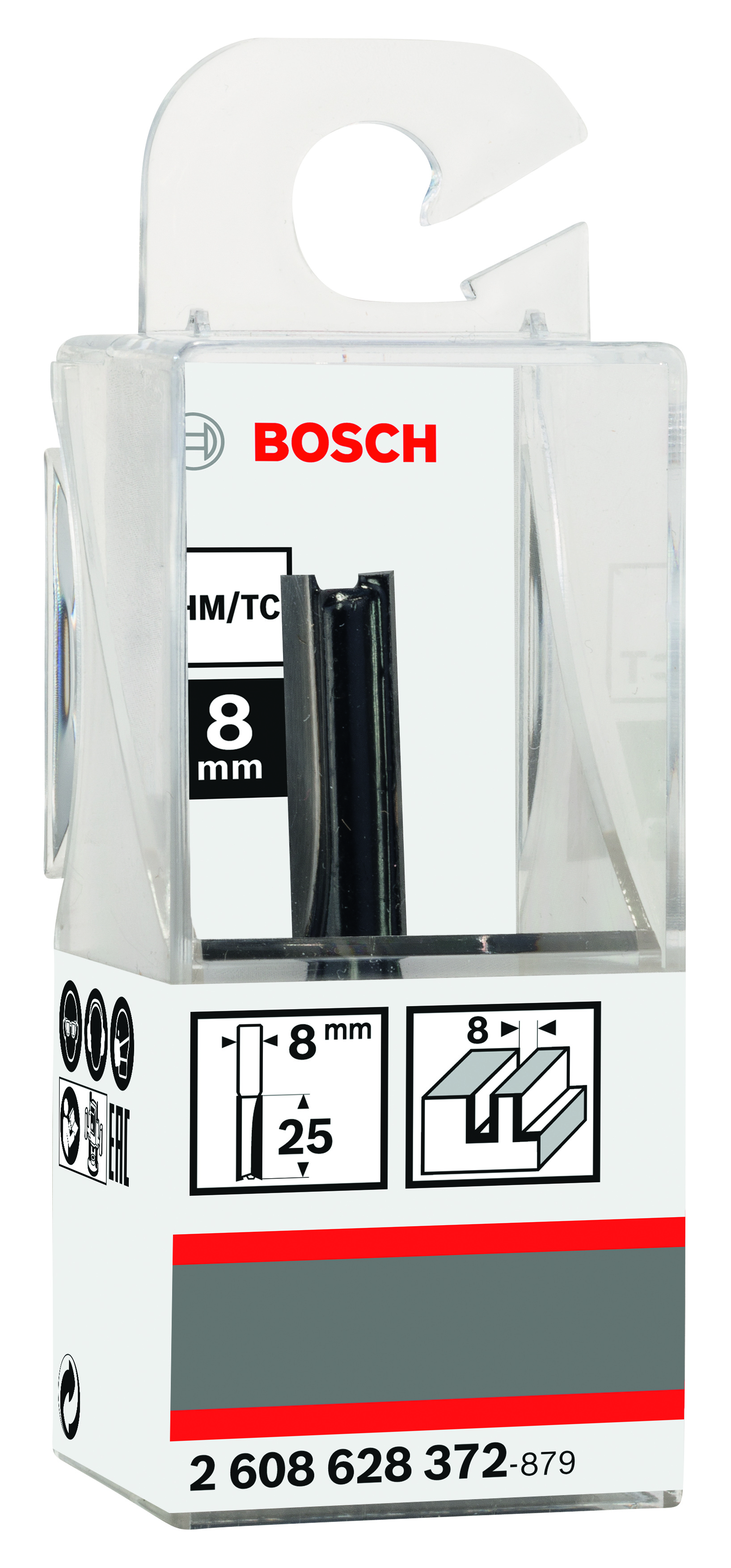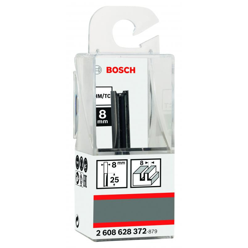 Emballage: 1Marque: BoschRéférence: 2608628372EAN: 3165140358330Description: Fraise à rainurer droit 8 mm, D1 8 mm, L 25,4 mm, G 56 mm