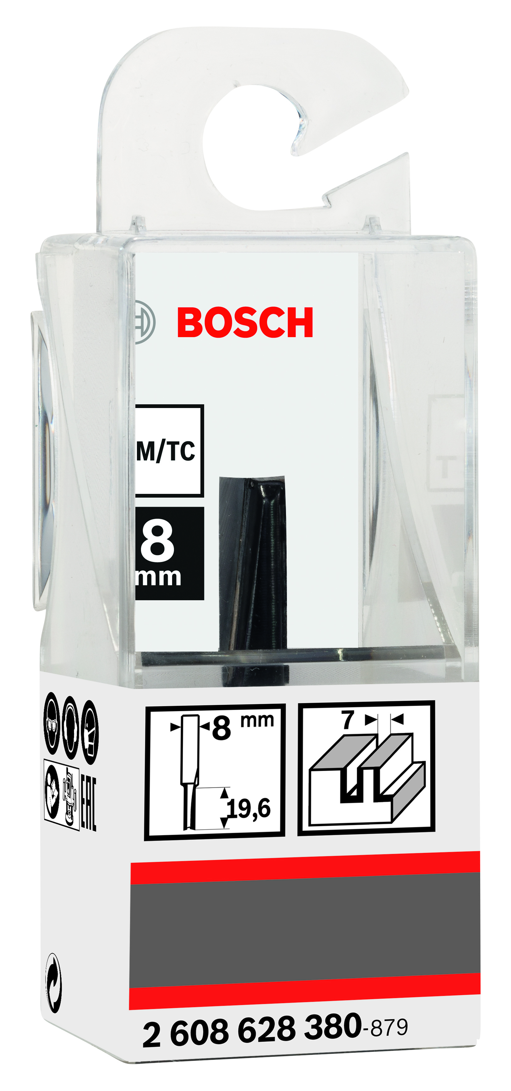 Emballage: 1Marque: BoschRéférence: 2608628380EAN: 3165140358415Description: Fraise à rainurer droit 8 mm, D1 7 mm, L 20 mm, G 51 mm
