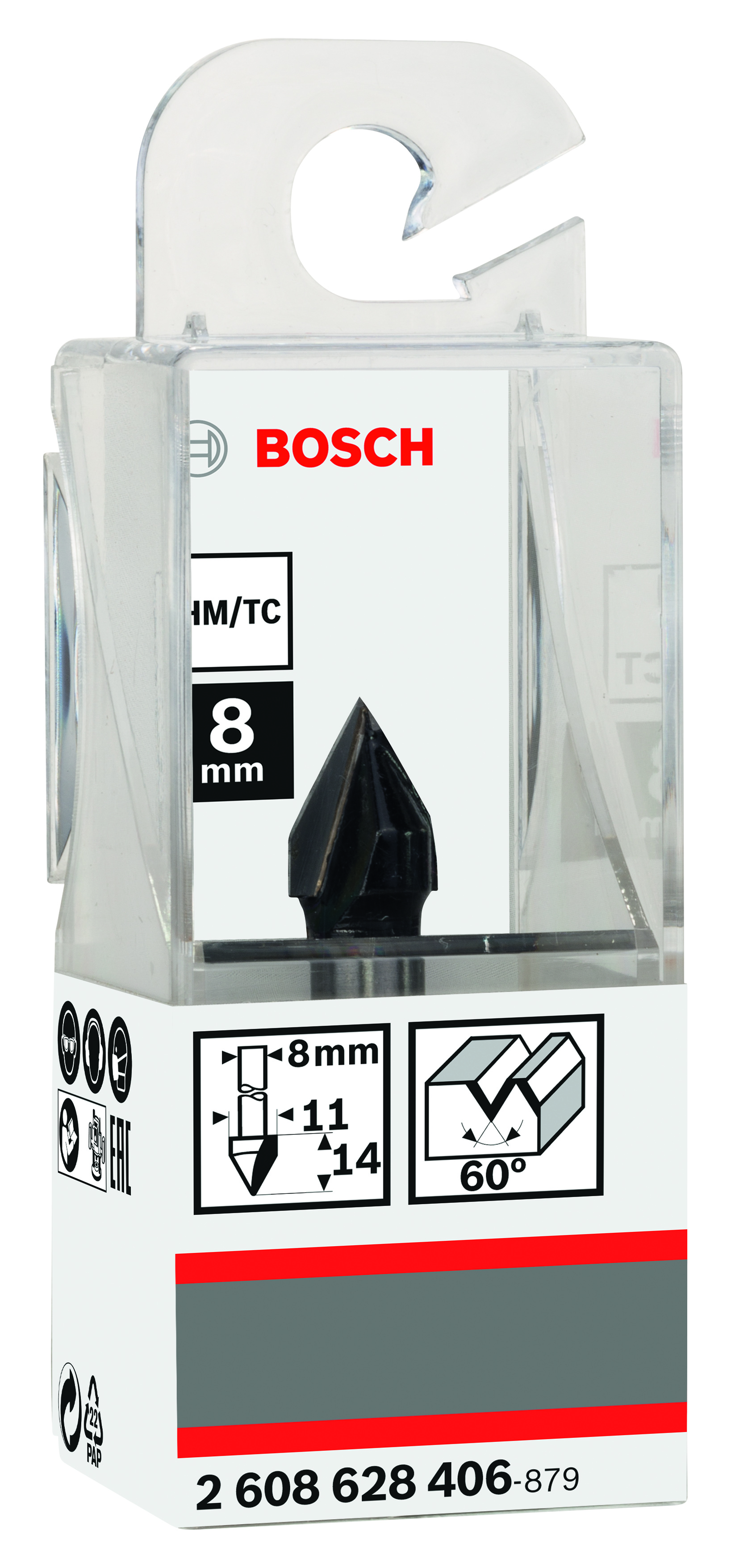 Emballage: 1Marque: BoschRéférence: 2608628406EAN: 3165140358675Description: Fraise à rainurer droit en V 8 mm, D1 11 mm, L 14 mm, G 45 mm, 60°