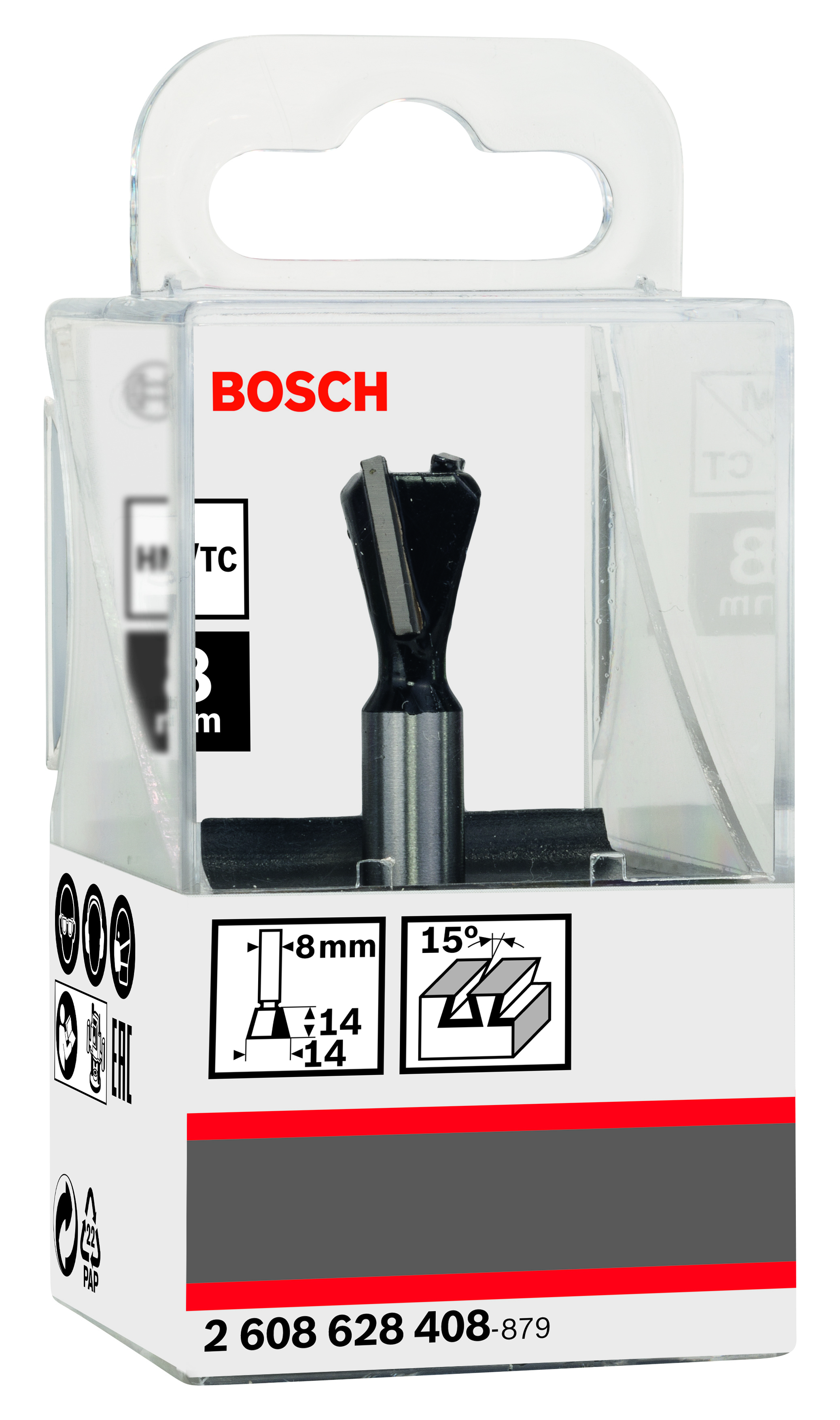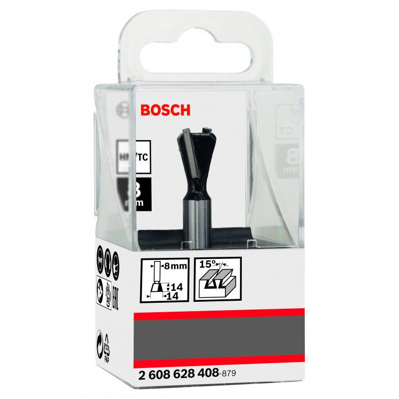 Emballage: 1Marque: BoschRéférence: 2608628408EAN: 3165140358699Description: Fraise à queue daronde 8 mm, D1 14 mm, L 14 mm, G 55 mm, 15°
