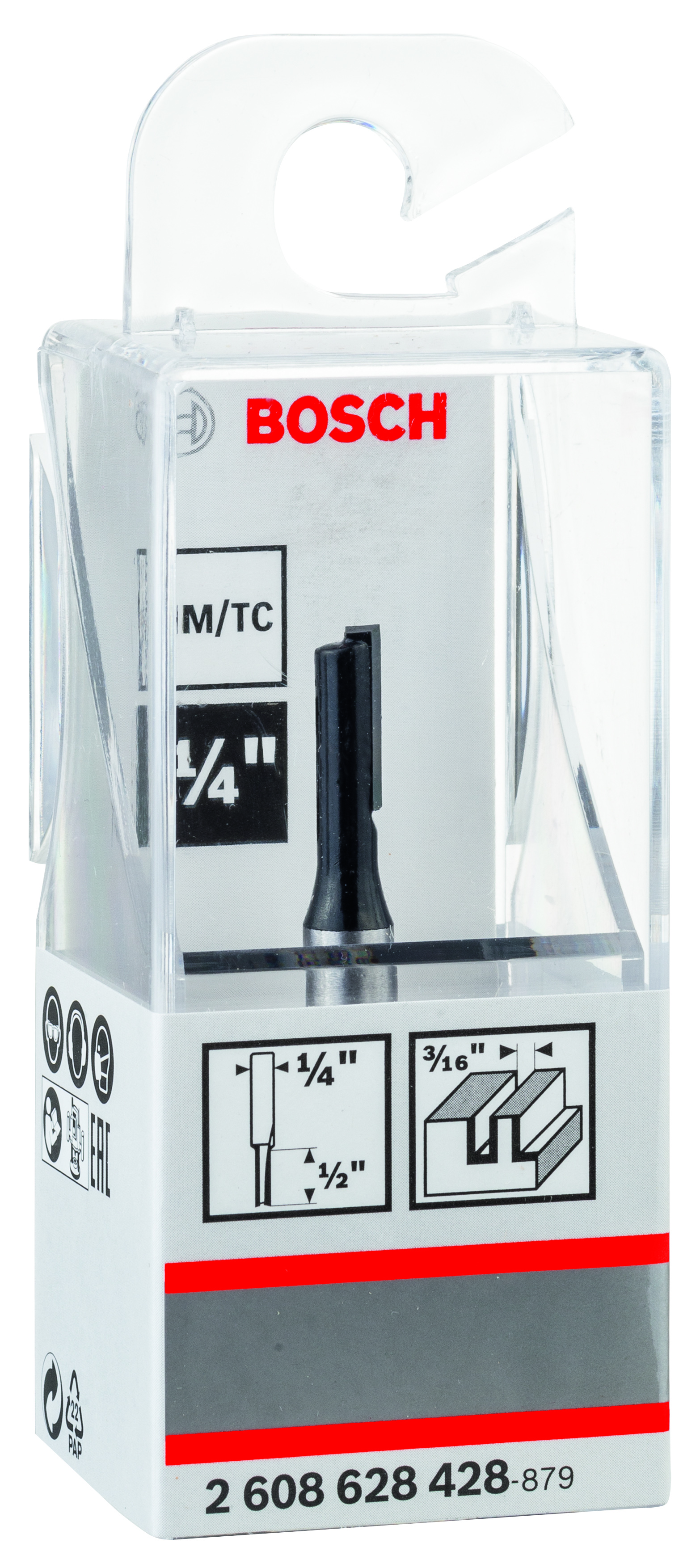 Emballage: 1Marque: BoschRéférence: 2608628428EAN: 3165140360982Description: Fraise à rainurer droit 1/4'', D1 4,8 mm, L 12,7 mm, G 51 mm