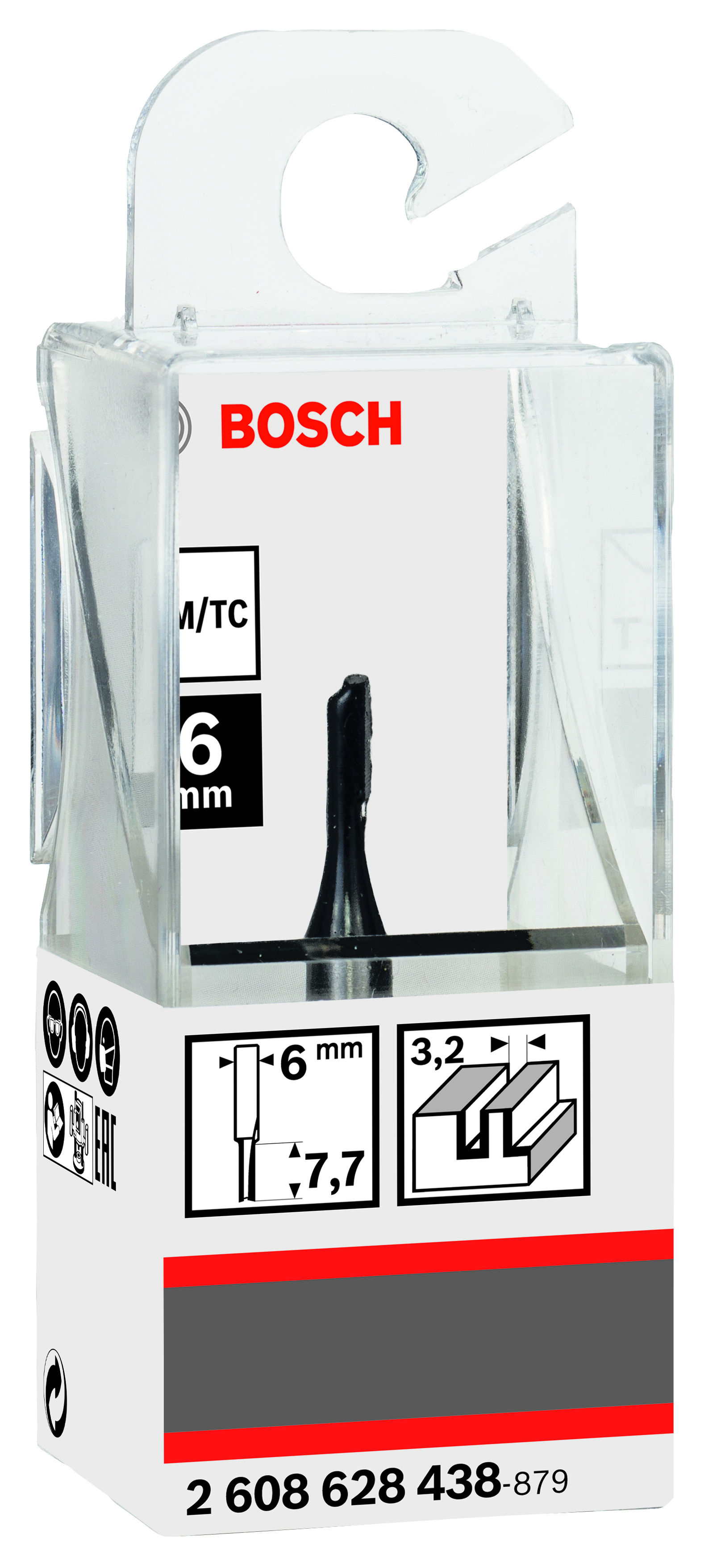 Emballage: 1Marque: BoschRéférence: 2608628438EAN: 3165140374118Description: Fraise à rainurer droit 6 mm, D1 3,2 mm, L 7,7 mm, G 51 mm