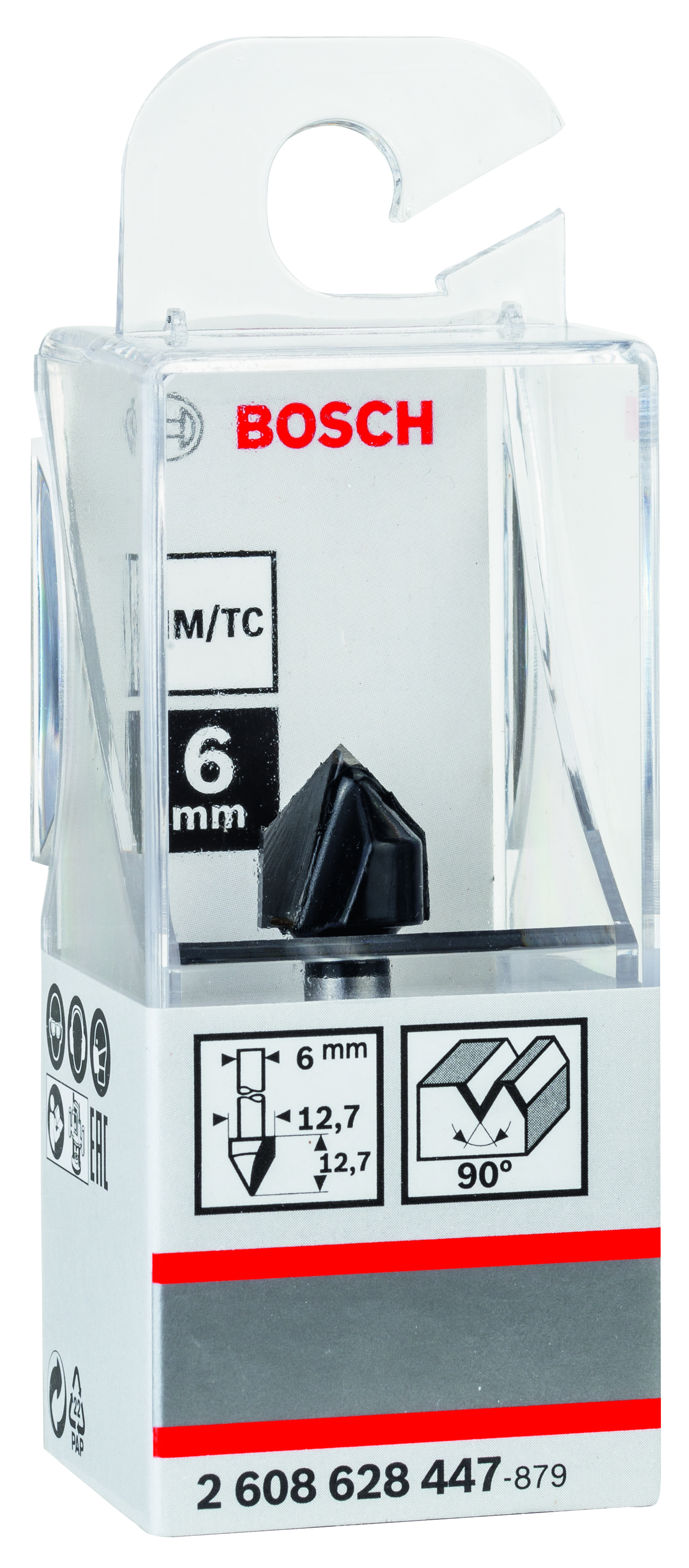 Emballage: 1 Marque: Bosch Référence: 2608628447 EAN: 3165140374200 Description: Fraise à rainurer droit en V 6 mm, D1 12,7 mm, L 12,7 mm, G 45 mm, 90°