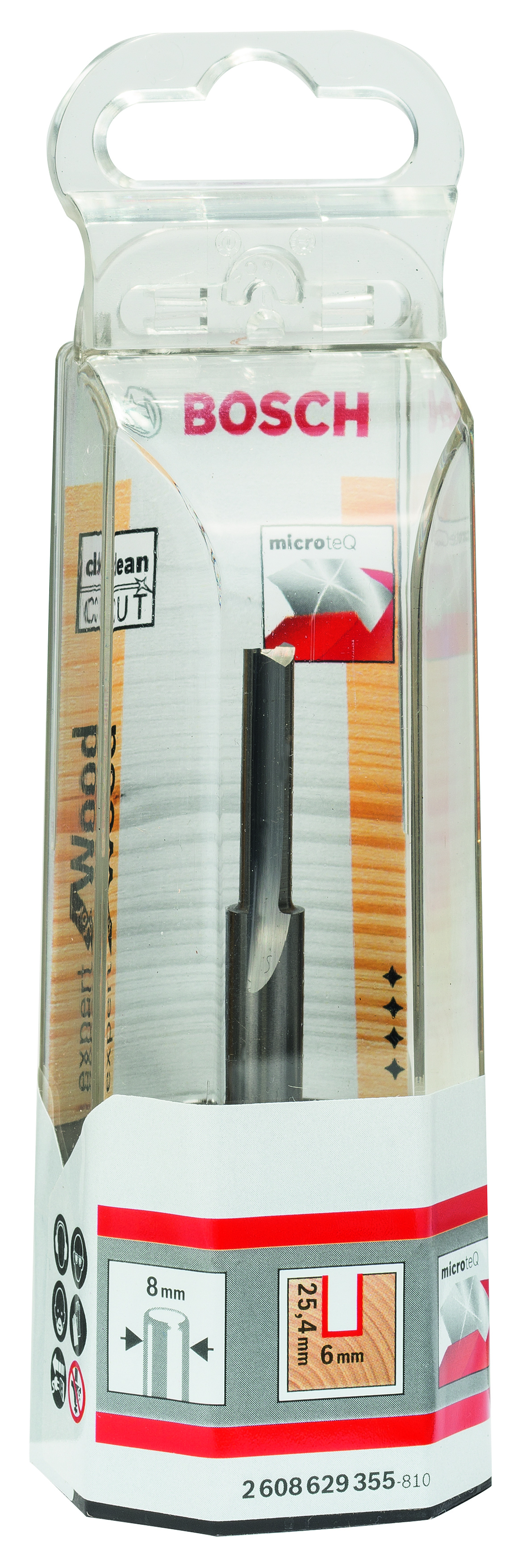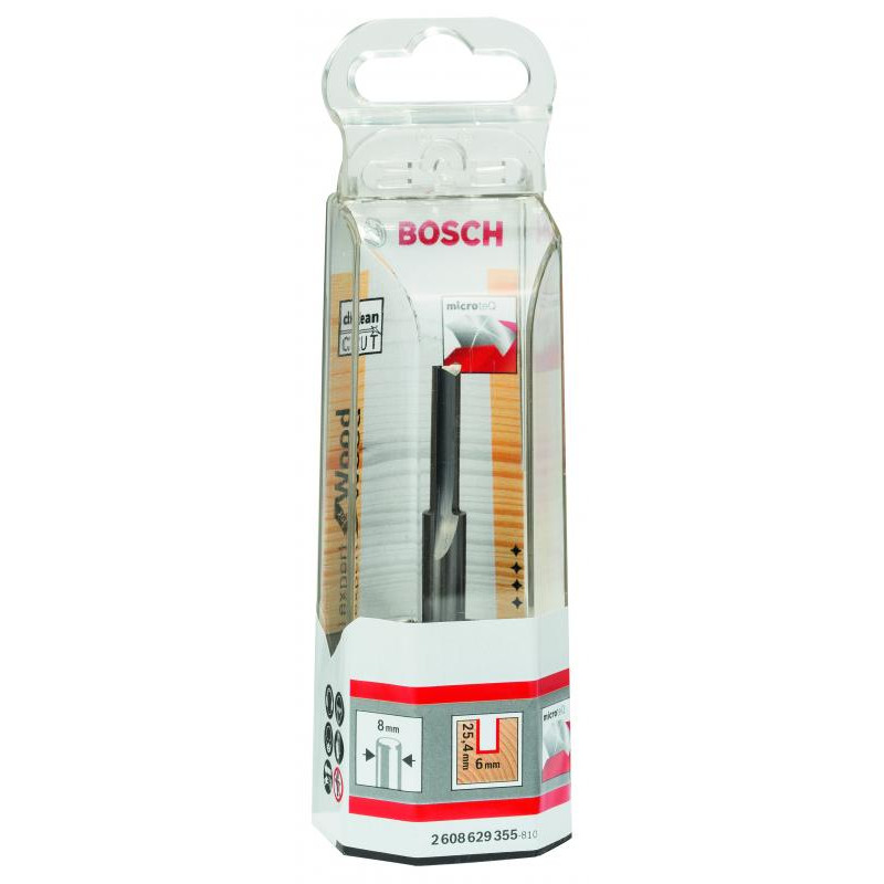 Emballage: 1Marque: BoschRéférence: 2608629355EAN: 3165140802024Description: Fraise à rainurer droit, en carbure 8 mm, D1 6 mm, L 25,4 mm, G 76 mm