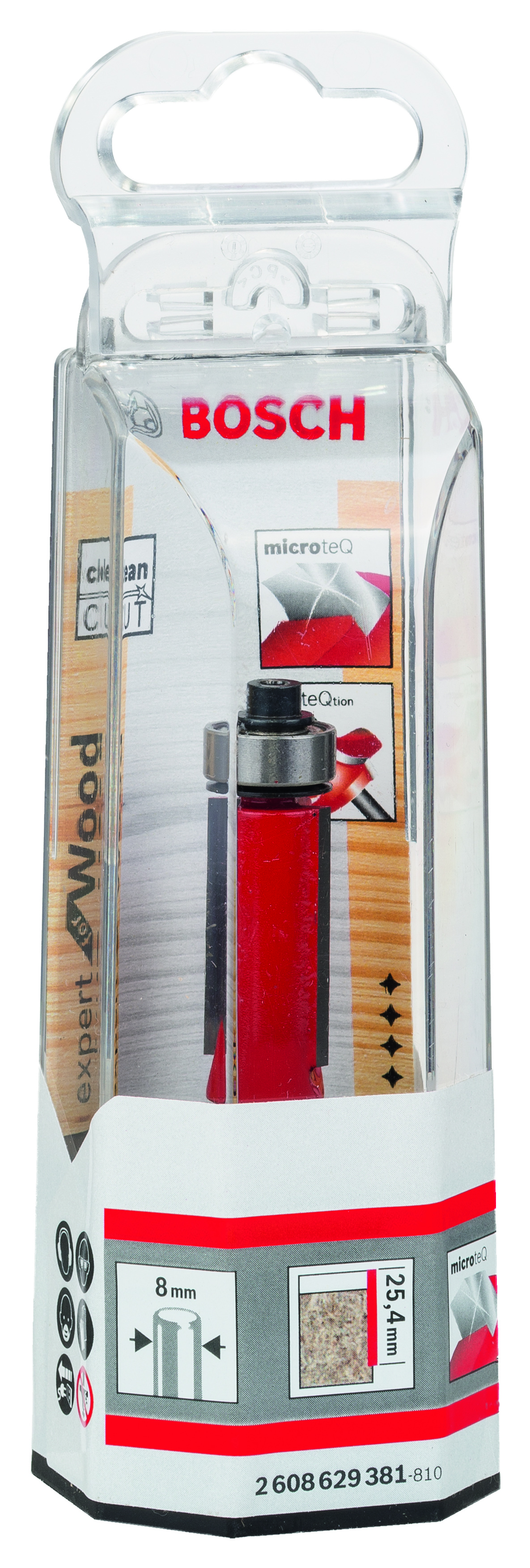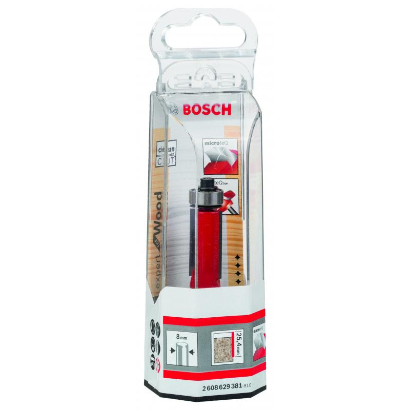 Emballage: 1Marque: BoschRéférence: 2608629381EAN: 3165140802284Description: Fraise à araser 8 mm, D1 12,7 mm, L 25,4 mm, G 71,5 mm