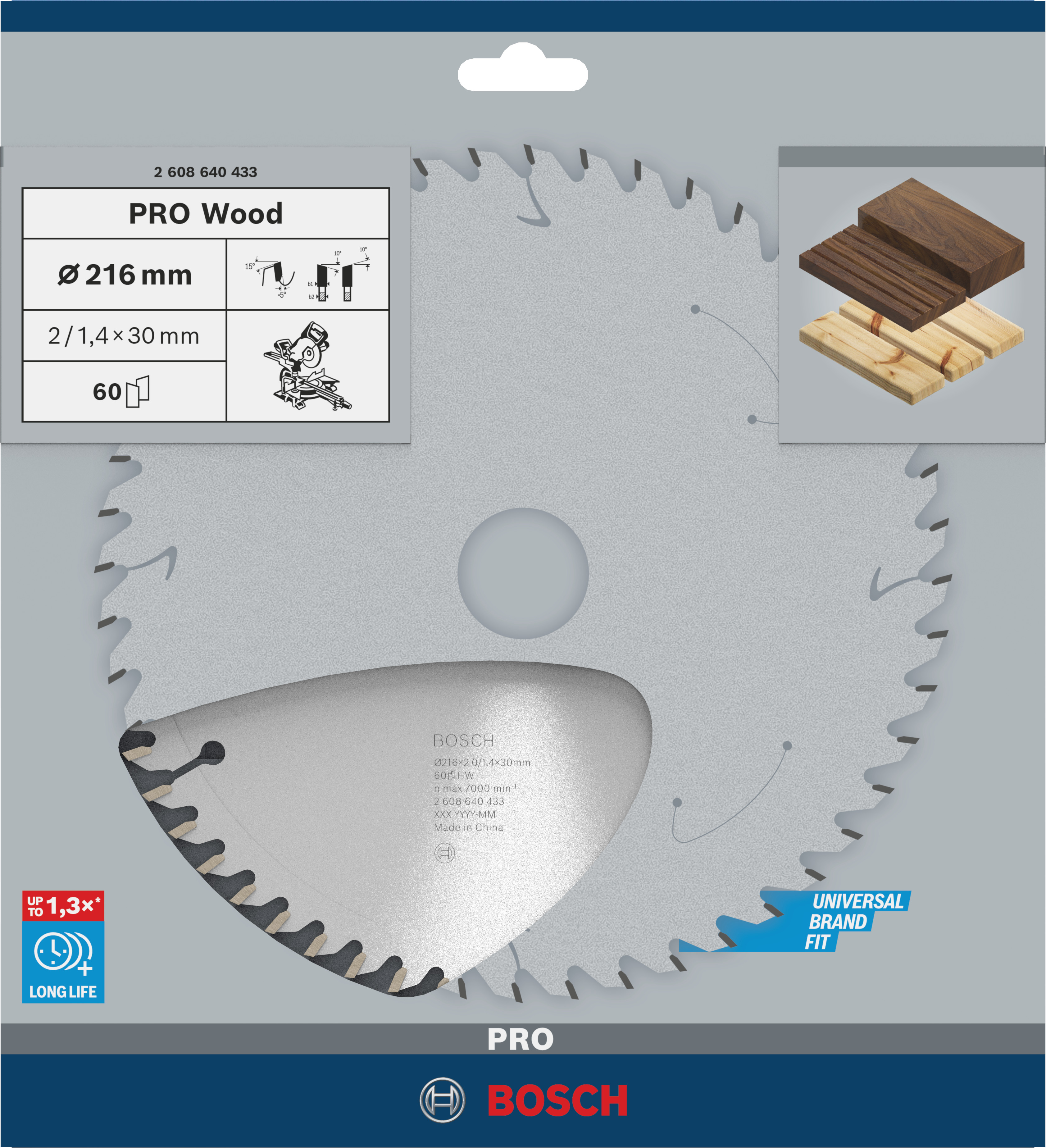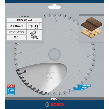 Emballage: 1Marque: BoschRéférence: 2608640433EAN: 3165140314428Description: Lame scie Circulaire PRO Bois 216x30x2,0mm ; 60D