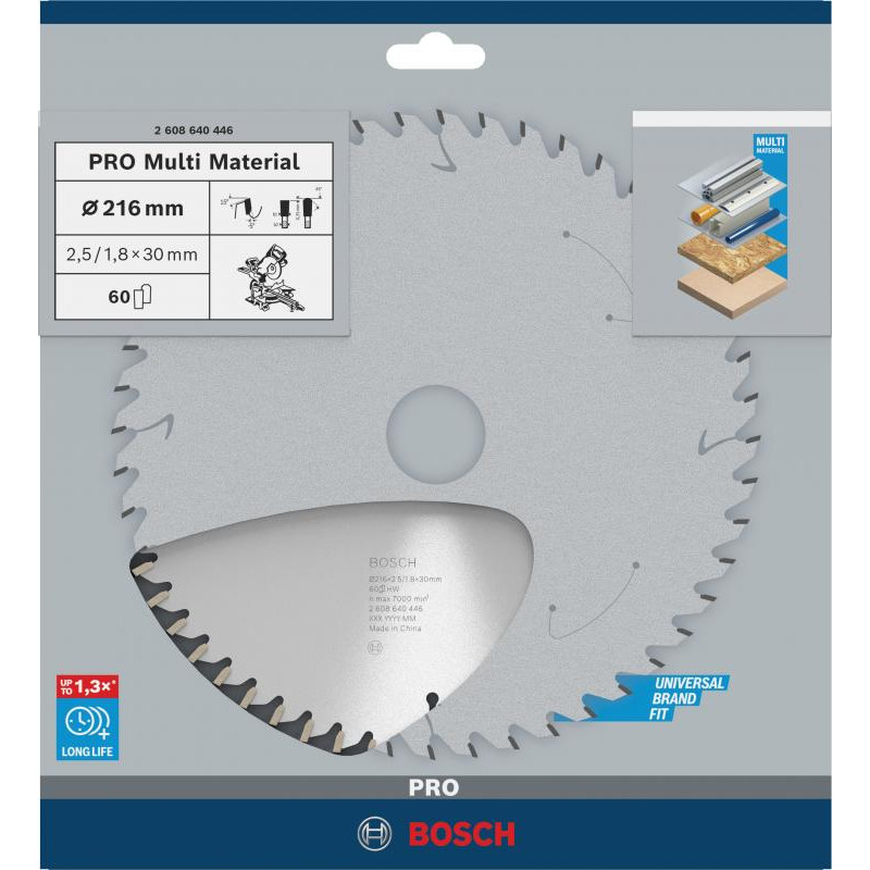 Emballage: 1Marque: BoschRéférence: 2608640446EAN: 3165140317443Description: Lame scie Circulaire PRO Multimatériaux 216x30x2,5mm ; 60D