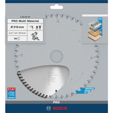 Emballage: 1Marque: BoschRéférence: 2608640447EAN: 3165140317450Description: Lame scie Circulaire PRO Multimatériaux 216x30x2,5mm ; 80D
