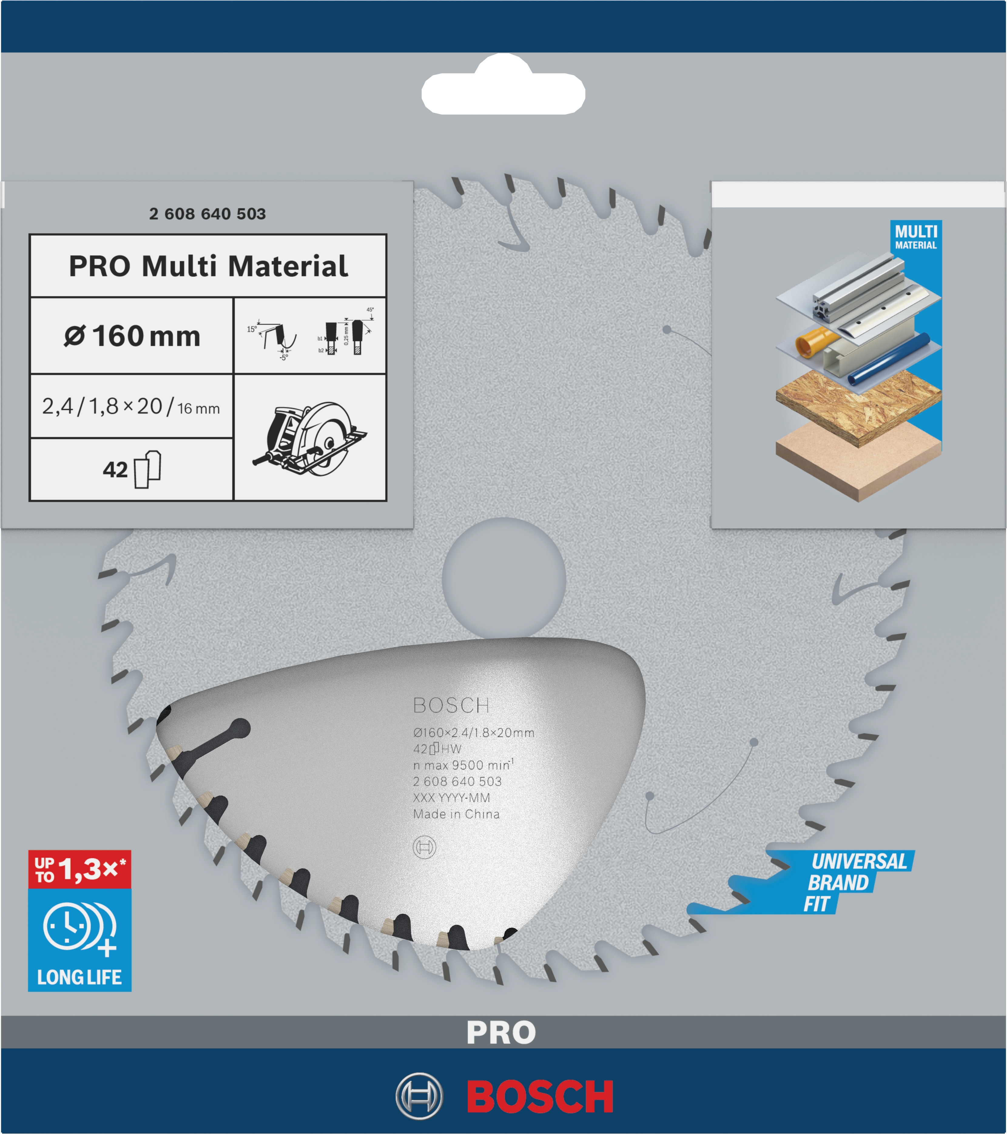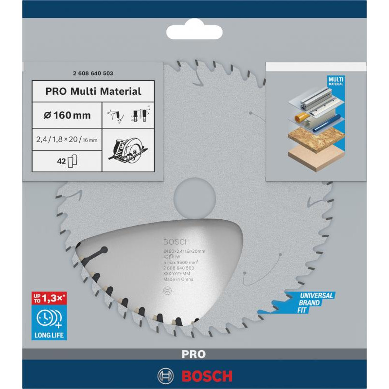 Emballage: 1Marque: BoschRéférence: 2608640503EAN: 3165140192934Description: Lame scie Circulaire PRO Multimatériaux 160x20/16x2,4mm ; 42D