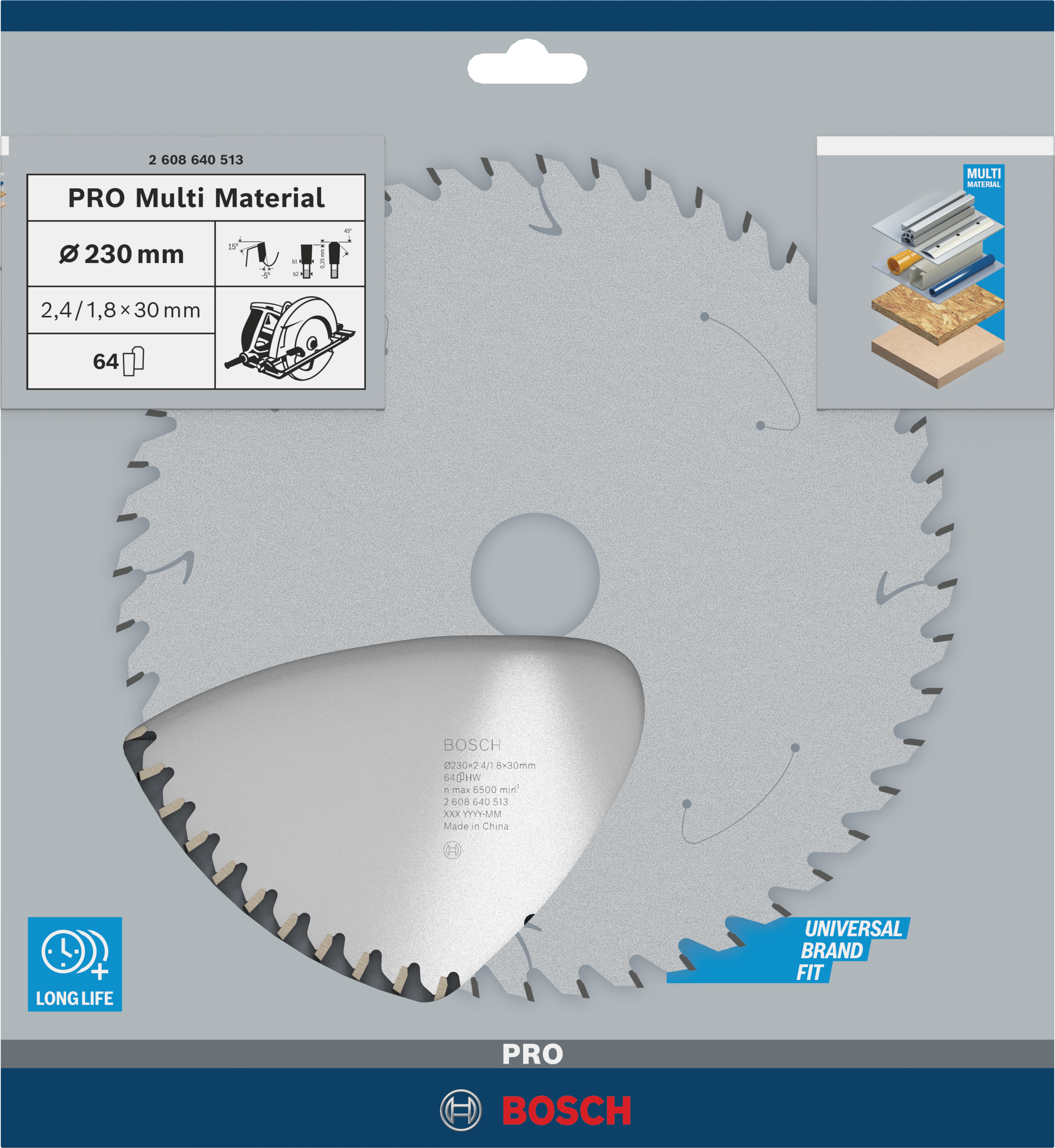Emballage: 1Marque: BoschRéférence: 2608640513EAN: 3165140193030Description: Lame scie Circulaire PRO Multimatériaux 230x30x2,4mm ; 64D