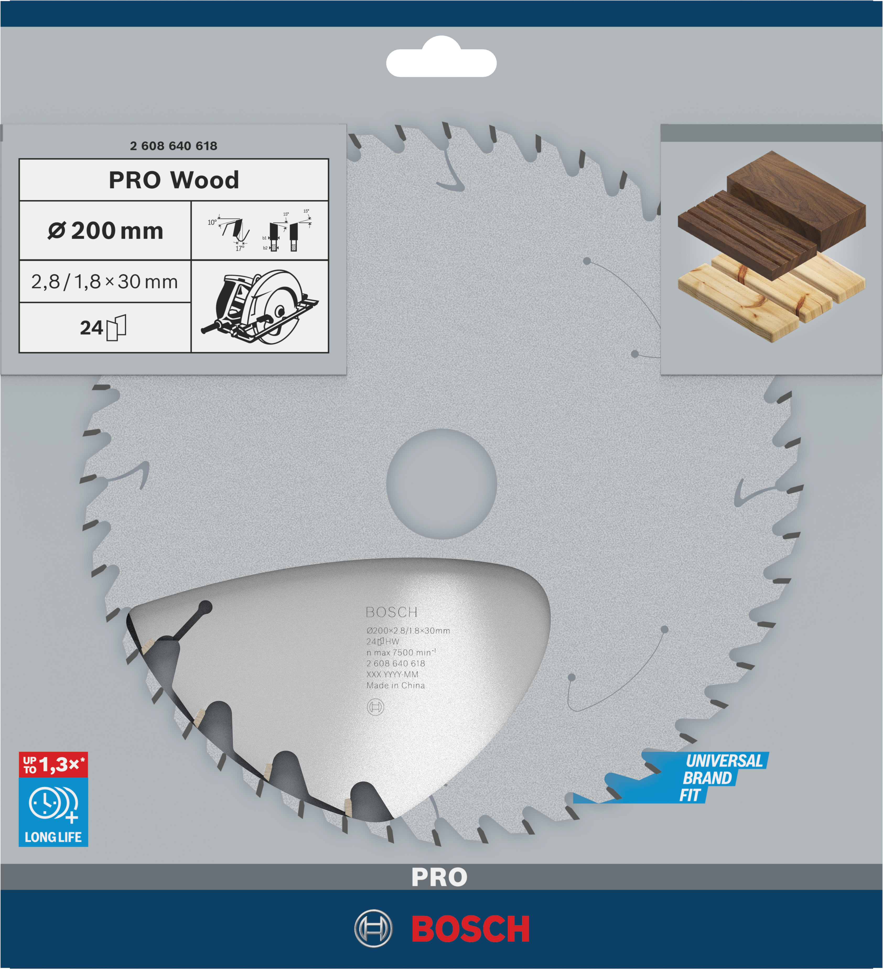Emballage: 1Marque: BoschRéférence: 2608640618EAN: 3165140194129Description: Lame scie Circulaire PRO Bois 200x30x2,8mm ; 24D