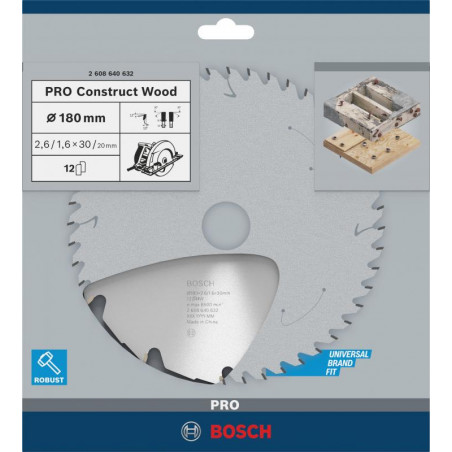 Emballage: 1Marque: BoschRéférence: 2608640632EAN: 3165140194259Description: Lame scie Circulaire PRO Bois de construction 180x30/20x2,6mm ; 12D
