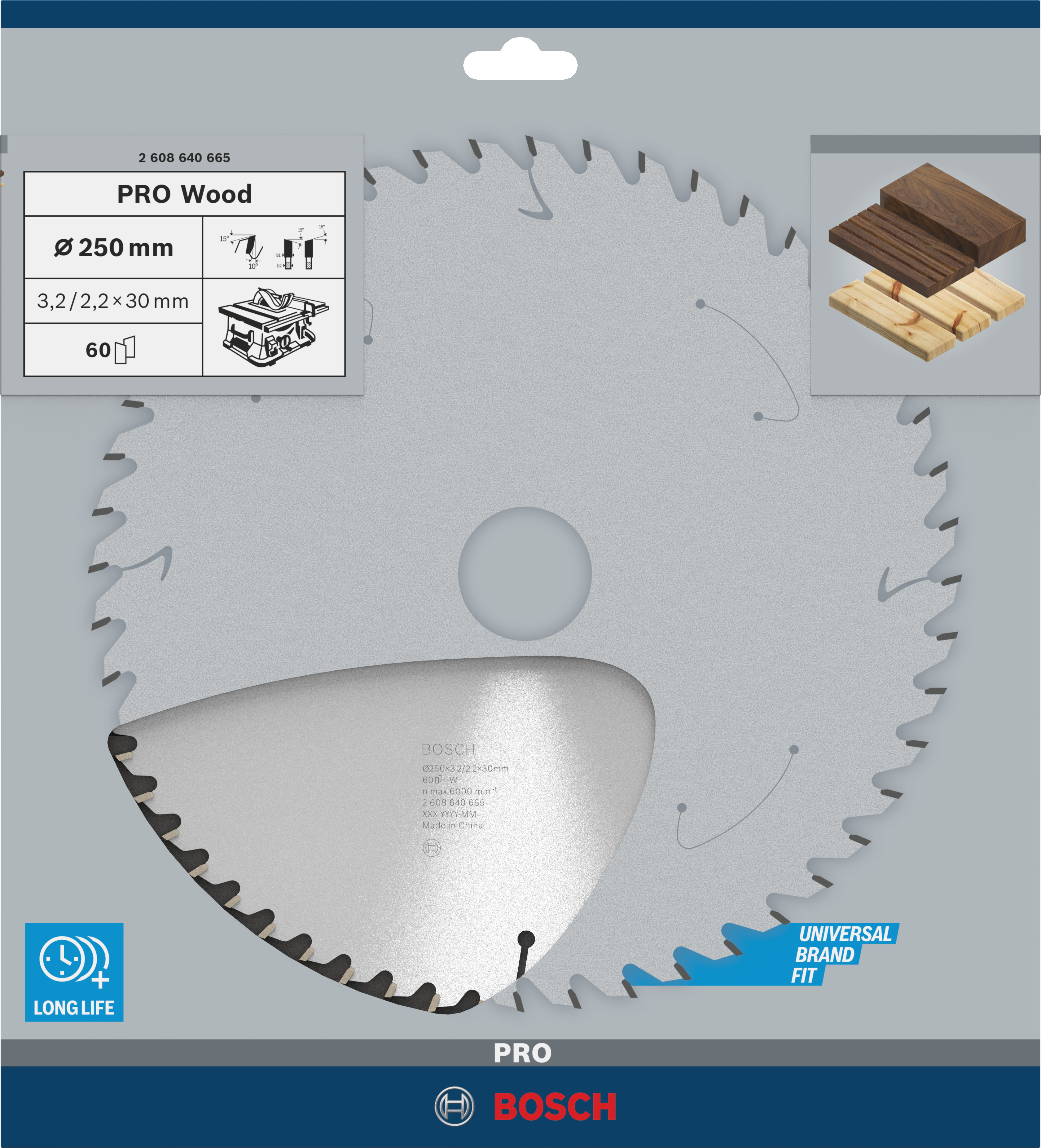 Emballage: 1Marque: BoschRéférence: 2608640665EAN: 3165140194532Description: Lame scie Circulaire sur table PRO Bois 250x30x3,2mm ; 60D