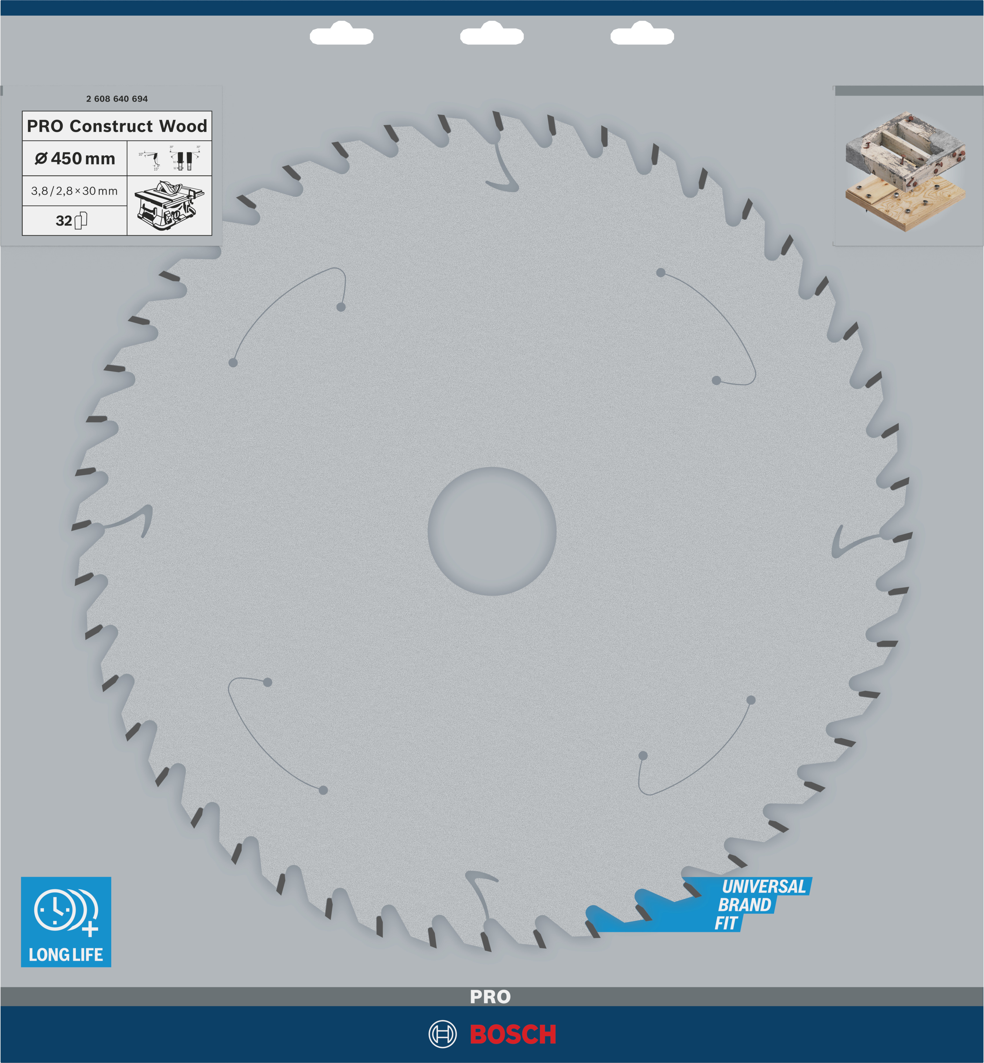 Emballage: 1Marque: BoschRéférence: 2608640694EAN: 3165140194778Description: Lame scie Circulaire PRO Bois de construction 450x30x3,8mm ; 32D
