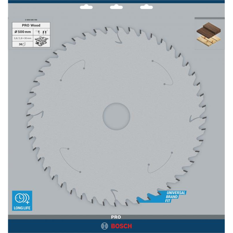 Emballage: 1Marque: BoschRéférence: 2608640705EAN: 3165140194846Description: Lame scie Circulaire PRO Bois 500x30x3,8mm ; 36D