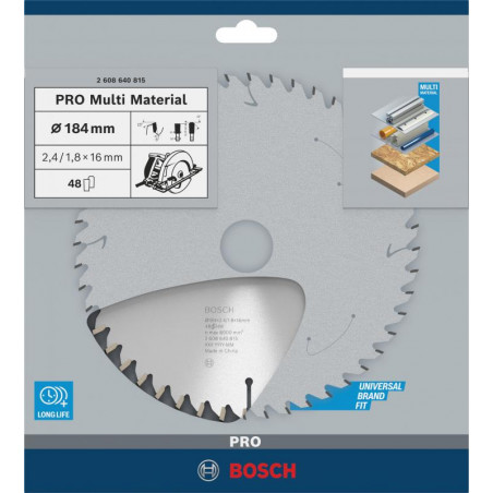 Emballage: 1Marque: BoschRéférence: 2608640815EAN: 3165140263405Description: Lame scie Circulaire PRO Multimatériaux 184x16x2,4mm ; 48D