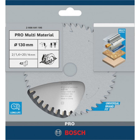 Emballage: 1Marque: BoschRéférence: 2608641195EAN: 3165140373777Description: Lame scie Circulaire PRO Multimatériaux 130x20/16x2,0mm ; 42D