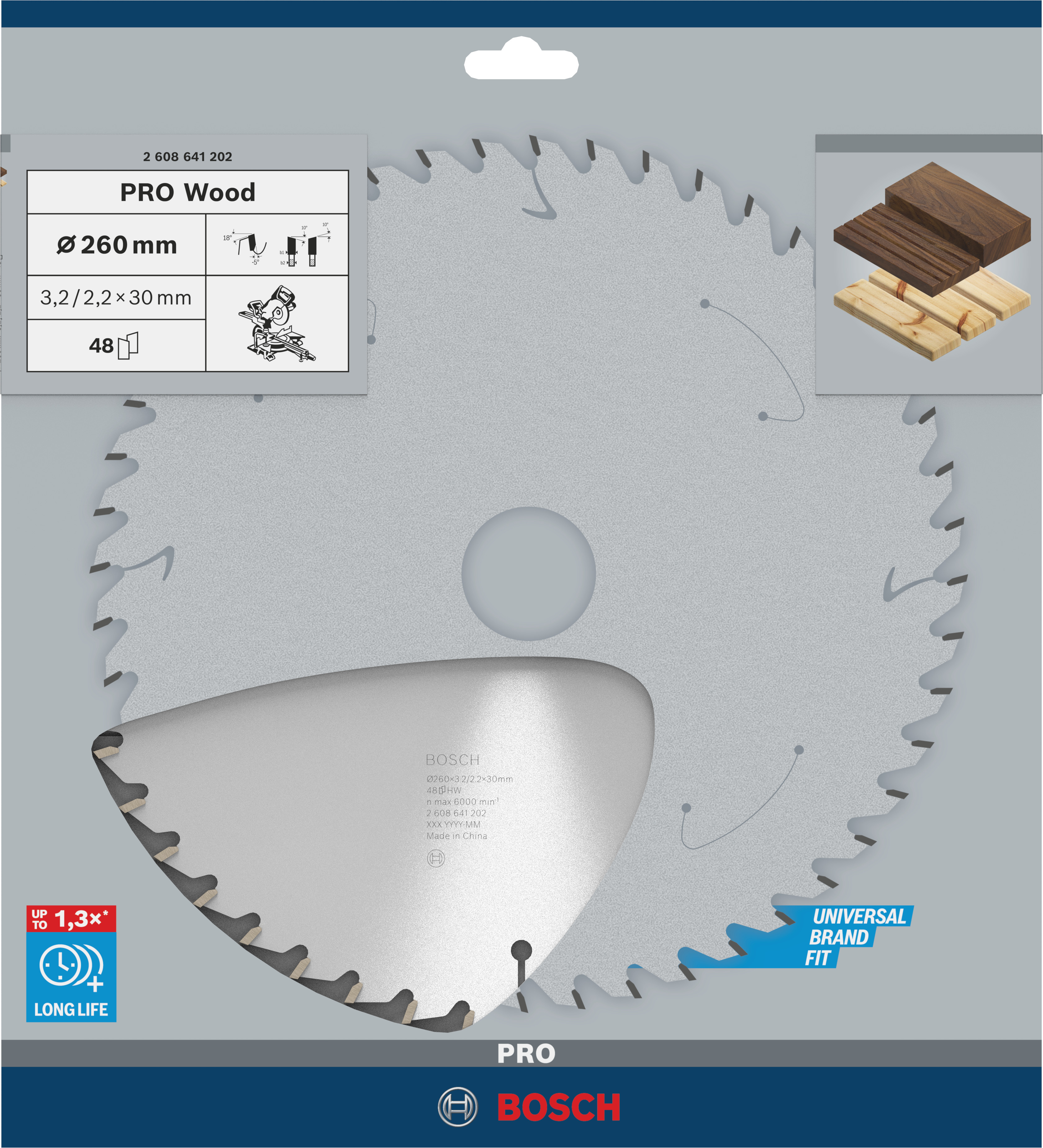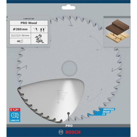 Emballage: 1Marque: BoschRéférence: 2608641202EAN: 3165140373845Description: Lame scie Circulaire PRO Bois 260x30x3,2mm ; 48D