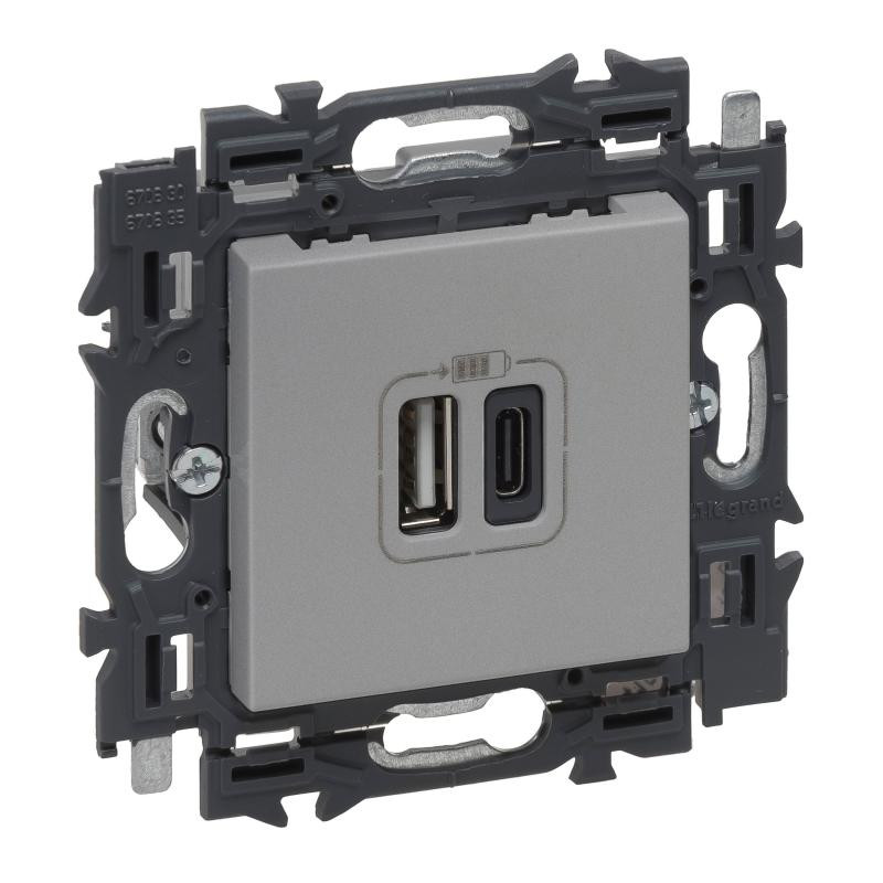 Emballage: 1 Marque: LegrandRéférence: 741636EAN: 3414971277175Description: Valena Next prise USB double type A+C appareil complet alu à griffes