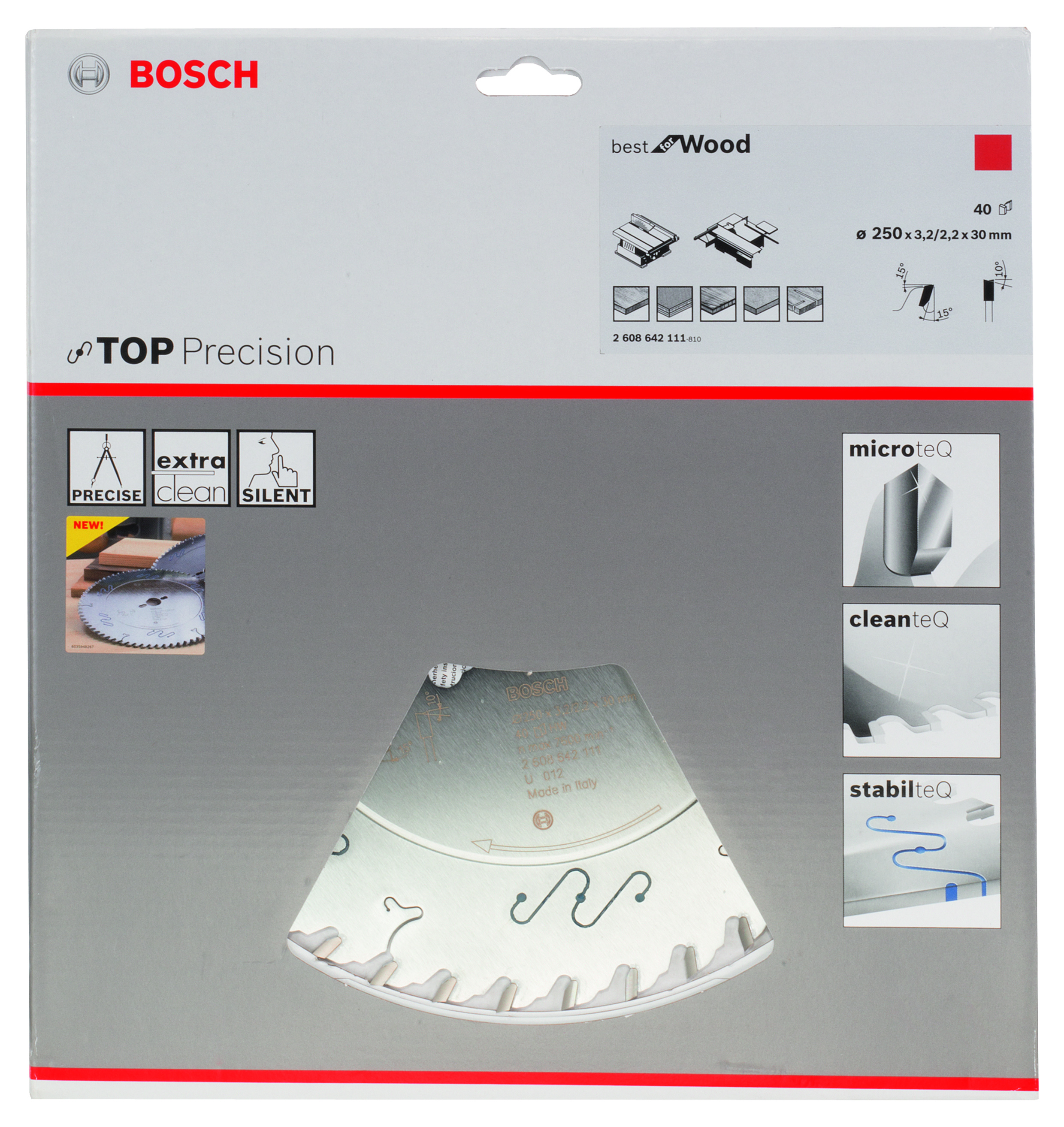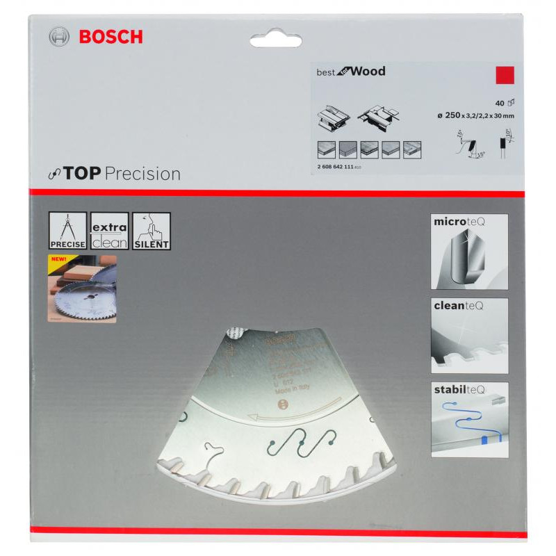 Emballage: 1 Marque: Bosch Référence: 2608642111 EAN: 3165140574518 Description: Lame de Scie Circulaire Top Precision Best pour Wood, 250 x 30 x 3,2 mm, 40D