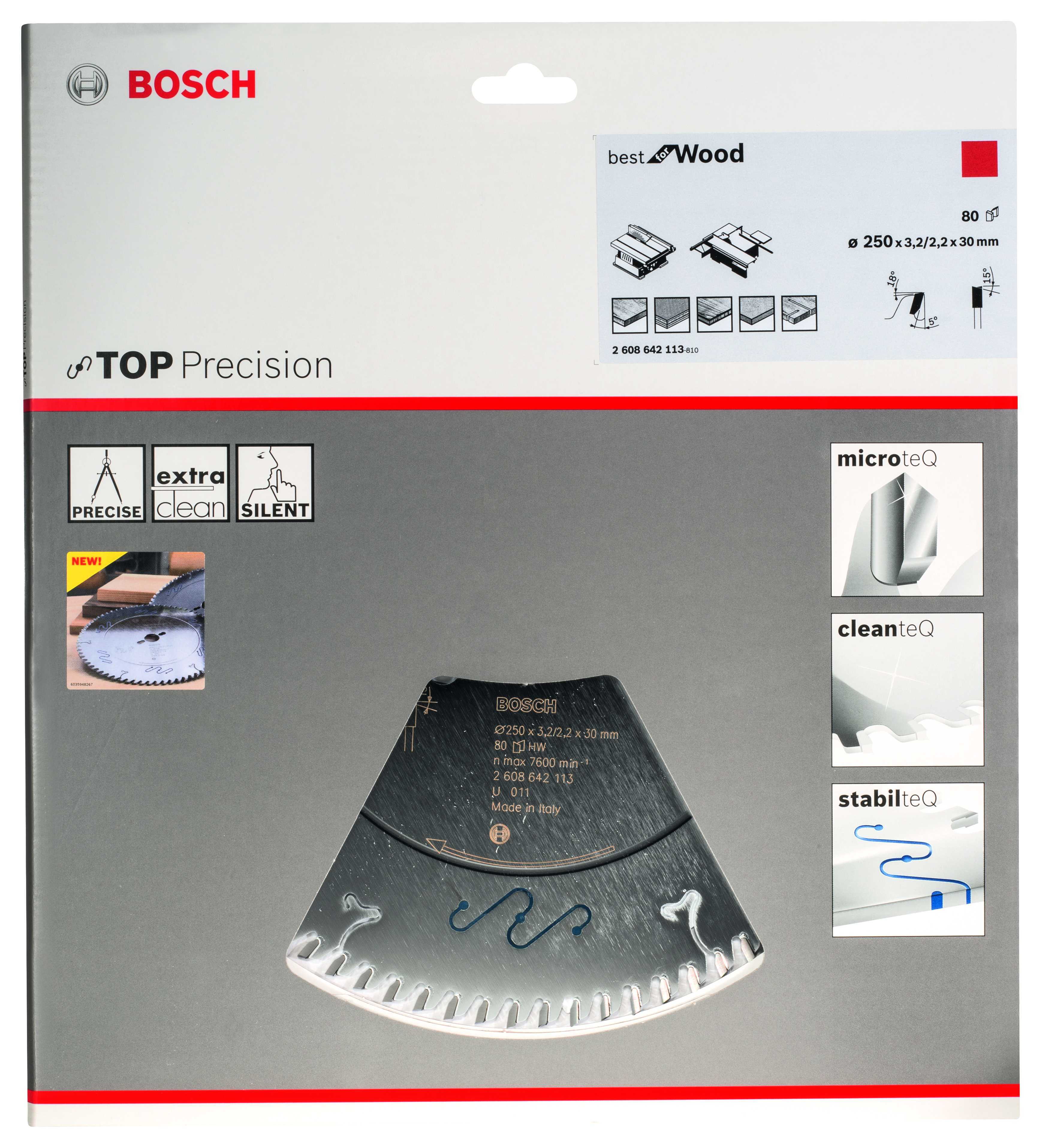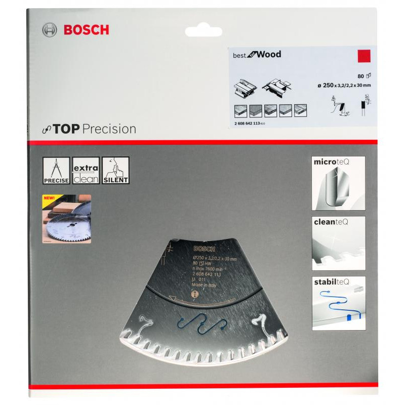Emballage: 1 Marque: Bosch Référence: 2608642113 EAN: 3165140574532 Description: Lame de Scie Circulaire Top Precision Best pour Wood, 250 x 30 x 3,2 mm, 80D