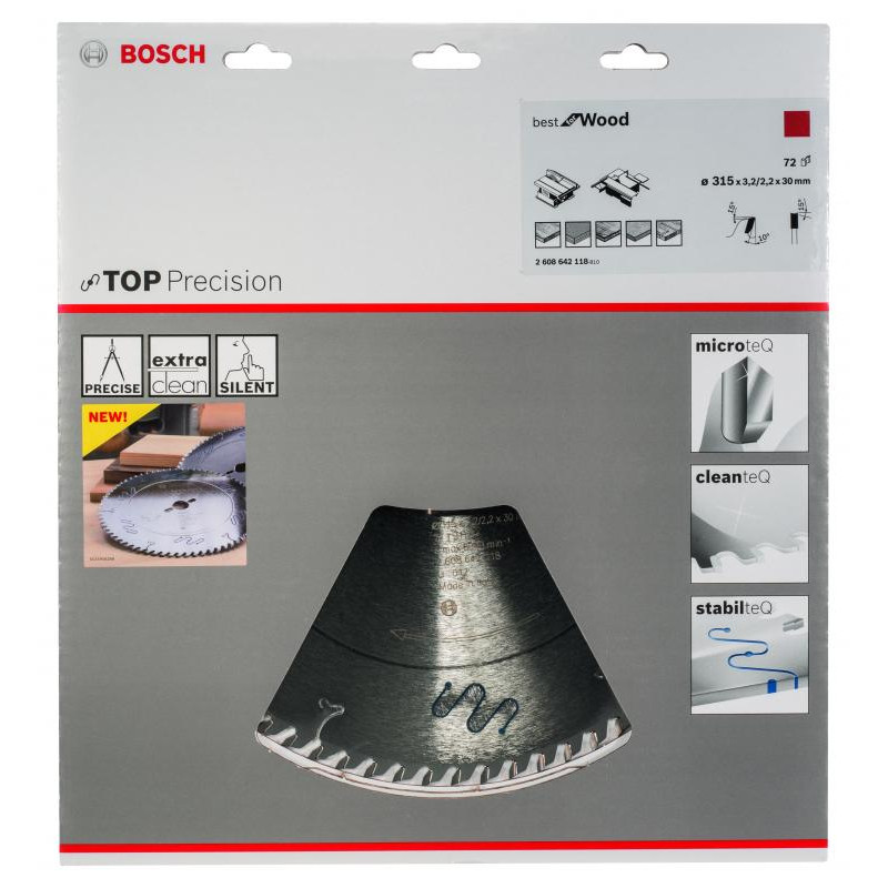 Emballage: 1 Marque: Bosch Référence: 2608642118 EAN: 3165140574587 Description: Lame de Scie Circulaire Top Precision Best pour Wood, 315 x 30 x 3,2 mm, 72D