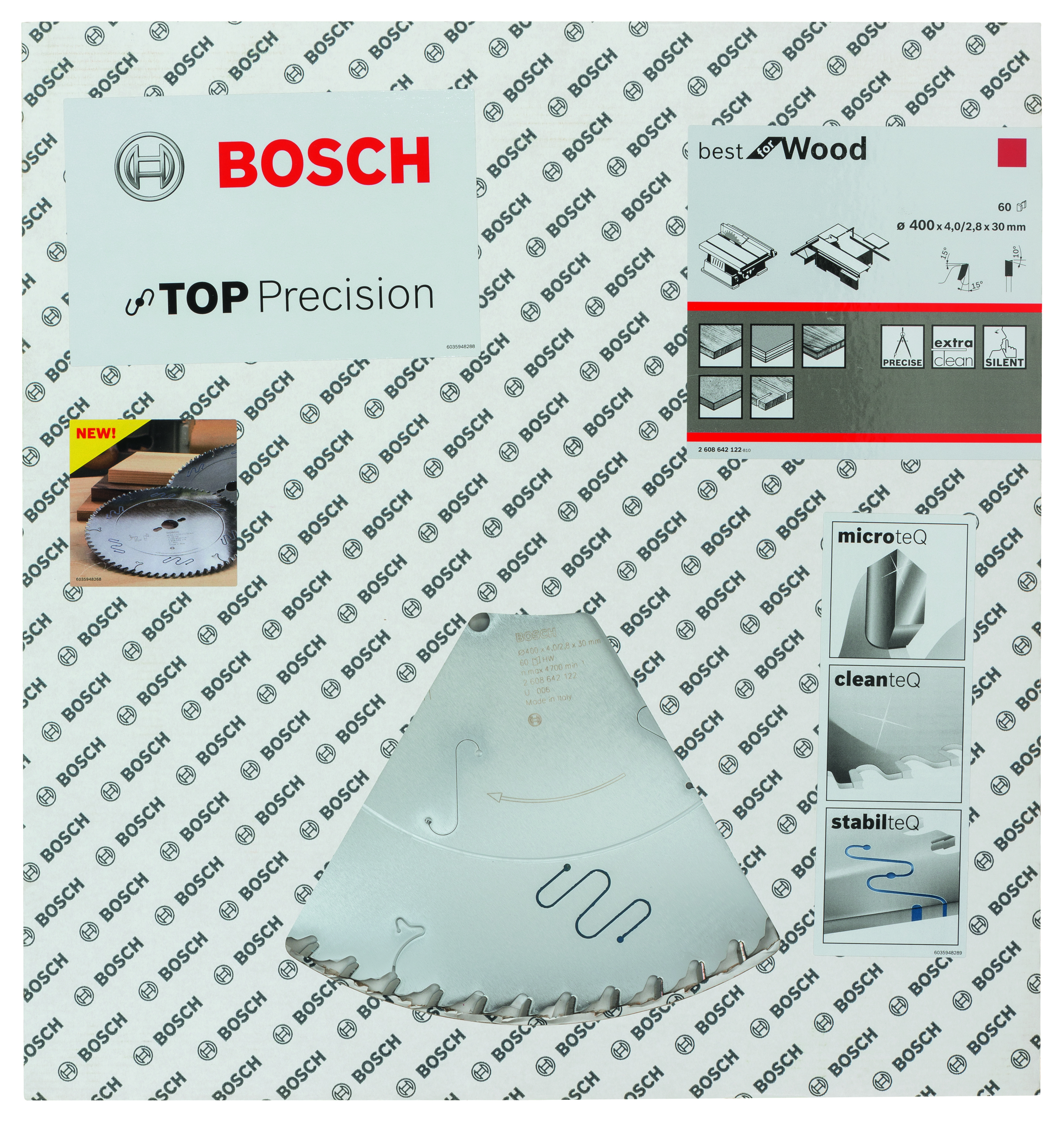 Emballage: 1 Marque: Bosch Référence: 2608642122 EAN: 3165140574624 Description: Lame de Scie Circulaire Top Precision Best pour Wood, 400 x 30 x 4 mm, 60D
