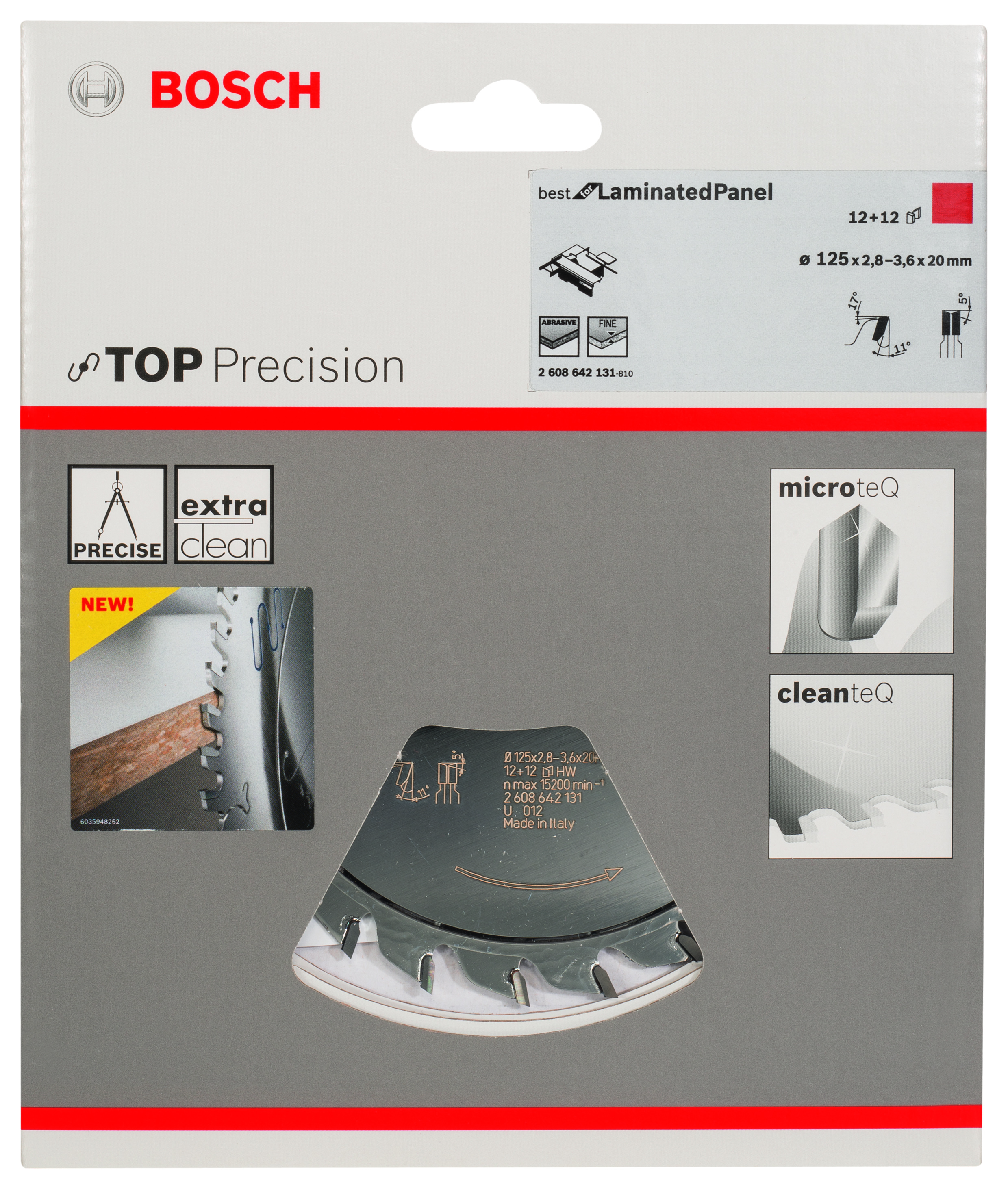 Emballage: 1Marque: BoschRéférence: 2608642131EAN: 3165140574709Description: Inciseur Top Precision Laminated Panel, 125 x 20 x 2,8/3,6 mm, 12+12D