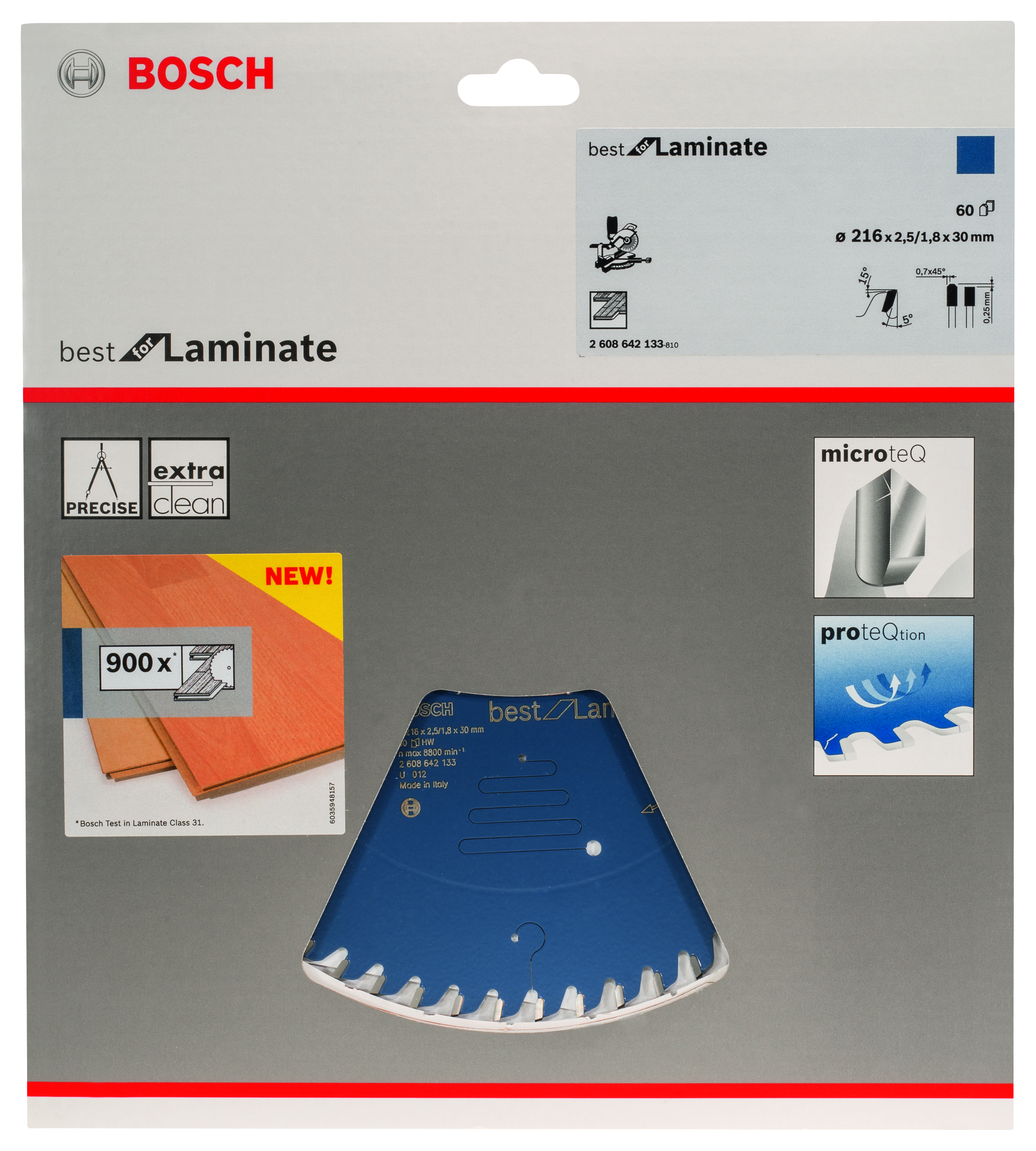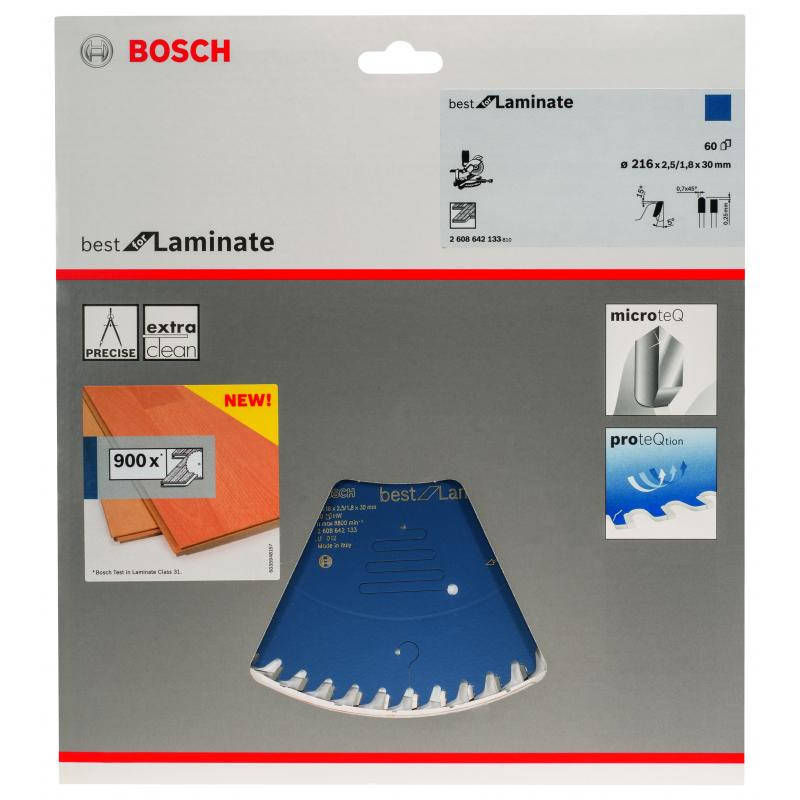 Emballage: 1Marque: BoschRéférence: 2608642133EAN: 3165140579568Description: Lame de Scie Circulaire Best pour Laminate, 216 x 30 x 2,5 mm, 60D