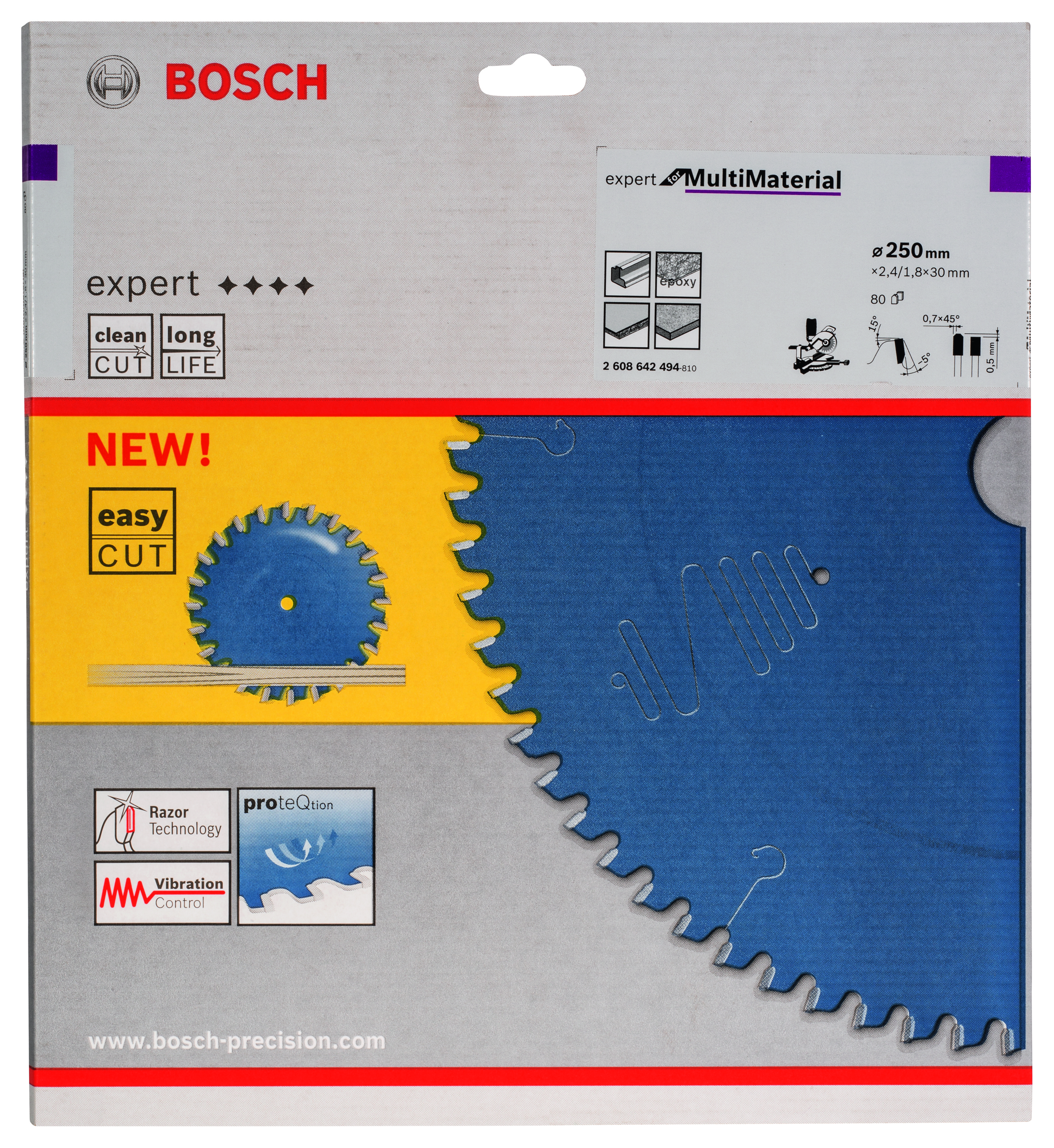 Emballage: 1 Marque: Bosch Référence: 2608642494 EAN: 3165140648196 Description: Lame de Scie Circulaire Expert pour Multi Material, 250 x 30 x 2,4 mm, 80D