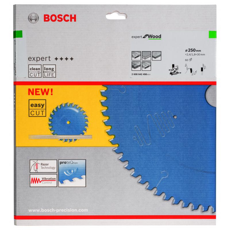 Emballage: 1Marque: BoschRéférence: 2608642498EAN: 3165140648233Description: Lame de Scie Circulaire Expert pour Wood, 250 x 30 x 2,4 mm, 60D