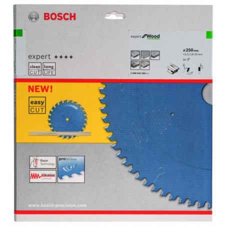 Emballage: 1Marque: BoschRéférence: 2608642500EAN: 3165140648257Description: Lame de Scie Circulaire Expert pour Wood, 250 x 30 x 2,5 mm, 80D