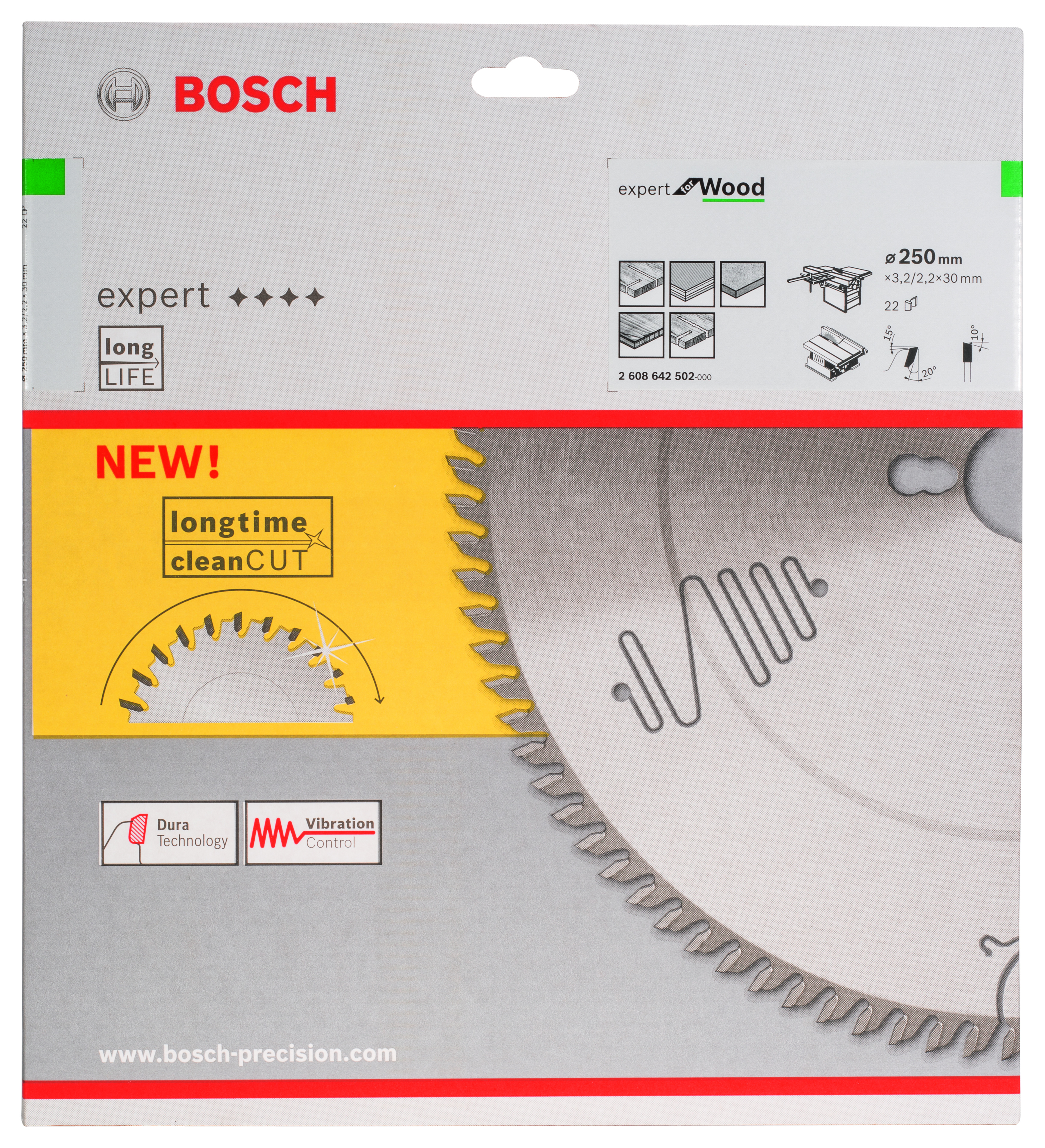 Emballage: 1Marque: BoschRéférence: 2608642502EAN: 3165140648271Description: Lame de Scie Circulaire Expert pour Wood, 250 x 30 x 3,2 mm, 22D