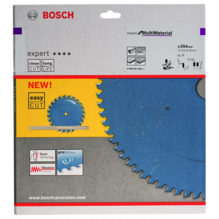 Emballage: 1 Marque: Bosch Référence: 2608642528 EAN: 3165140650106 Description: Lame de Scie Circulaire Expert pour Multi Material, 254 x 30 x 2,4 mm, 80D