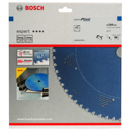 Emballage: 1Marque: BoschRéférence: 2608643055EAN: 3165140737685Description: Lame de Scie Circulaire Expert pour Steel, 184 x 20 x 2 mm, 48D