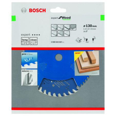 Emballage: 1Marque: BoschRéférence: 2608644007EAN: 3165140795739Description: Lame de Scie Circulaire Expert pour Wood, 130 x 20 x 2,4 mm, 36D