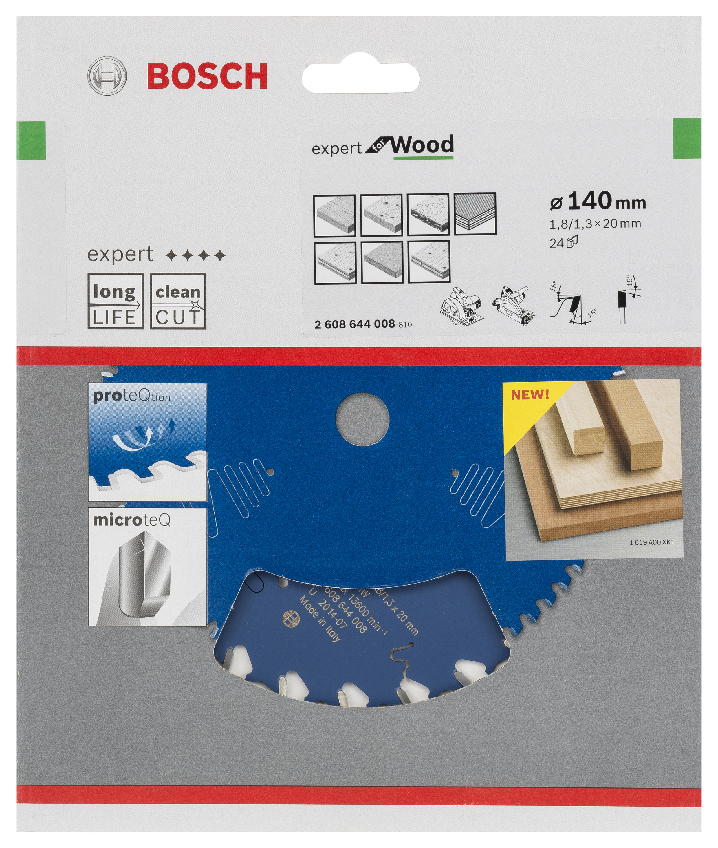 Emballage: 1Marque: BoschRéférence: 2608644008EAN: 3165140795746Description: Lame de Scie Circulaire Expert pour Wood, 140 x 20 x 1,8 mm, 24D
