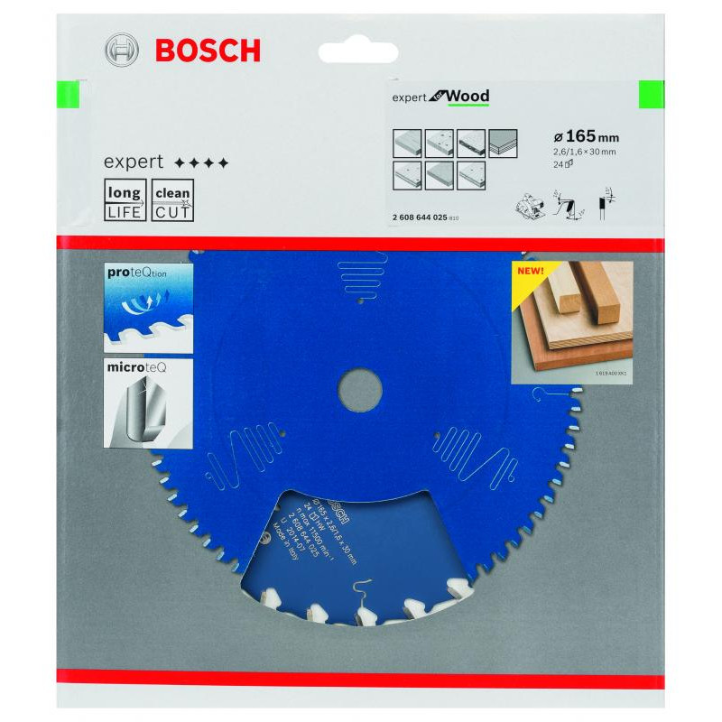 Emballage: 1Marque: BoschRéférence: 2608644025EAN: 3165140795913Description: Lame de Scie Circulaire Expert pour Wood, 165 x 30 x 2,6 mm, 24D