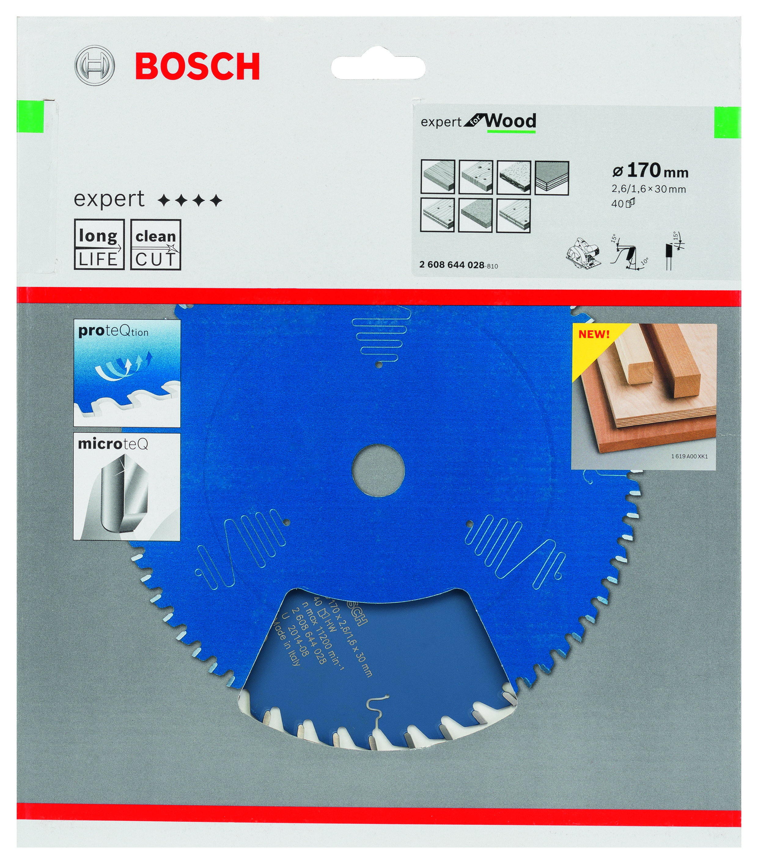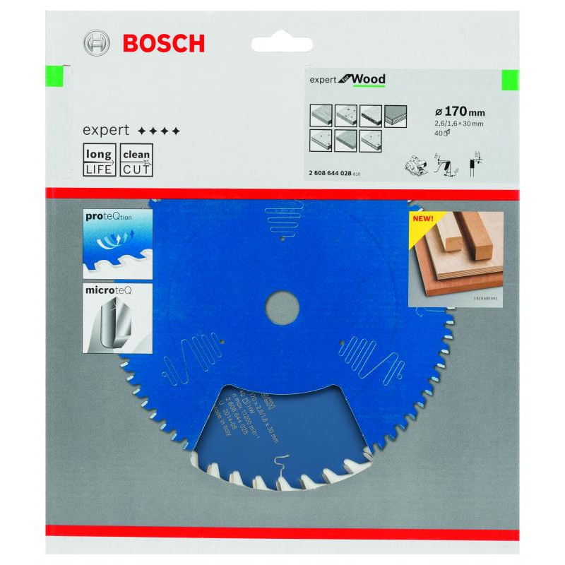 Emballage: 1Marque: BoschRéférence: 2608644028EAN: 3165140795944Description: Lame de Scie Circulaire Expert pour Wood, 170 x 30 x 2,6 mm, 40D