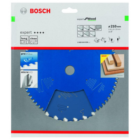 Emballage: 1Marque: BoschRéférence: 2608644058EAN: 3165140796248Description: Lame de Scie Circulaire Expert pour Wood, 210 x 30 x 2,8 mm, 30D