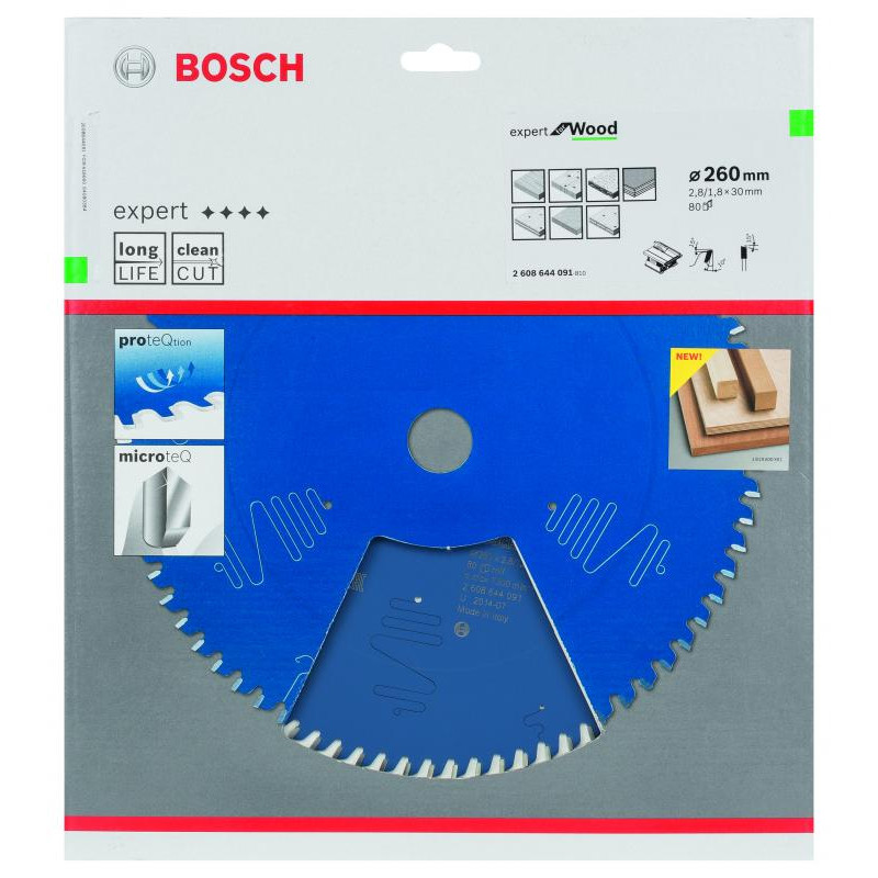 Emballage: 1Marque: BoschRéférence: 2608644091EAN: 3165140796576Description: Lame de Scie Circulaire Expert pour Wood, 260 x 30 x 2,8 mm, 80D