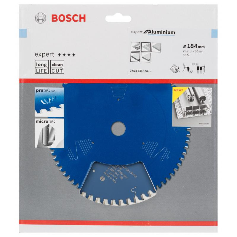 Emballage: 1Marque: BoschRéférence: 2608644100EAN: 3165140796668Description: Lame de Scie Circulaire Expert pour Aluminium, 184 x 30 x 2,6 mm, 56D