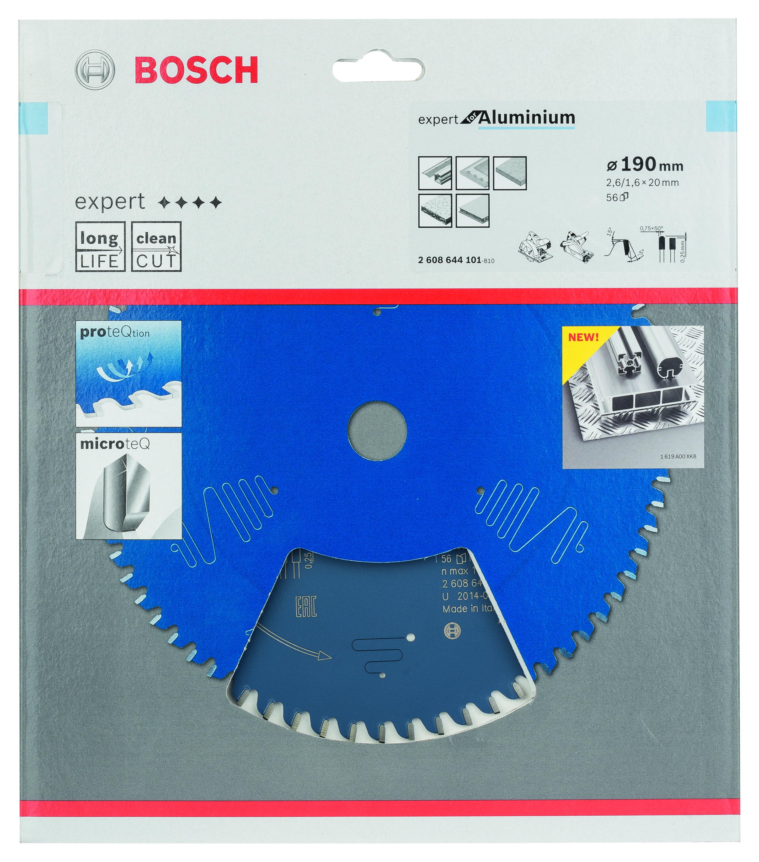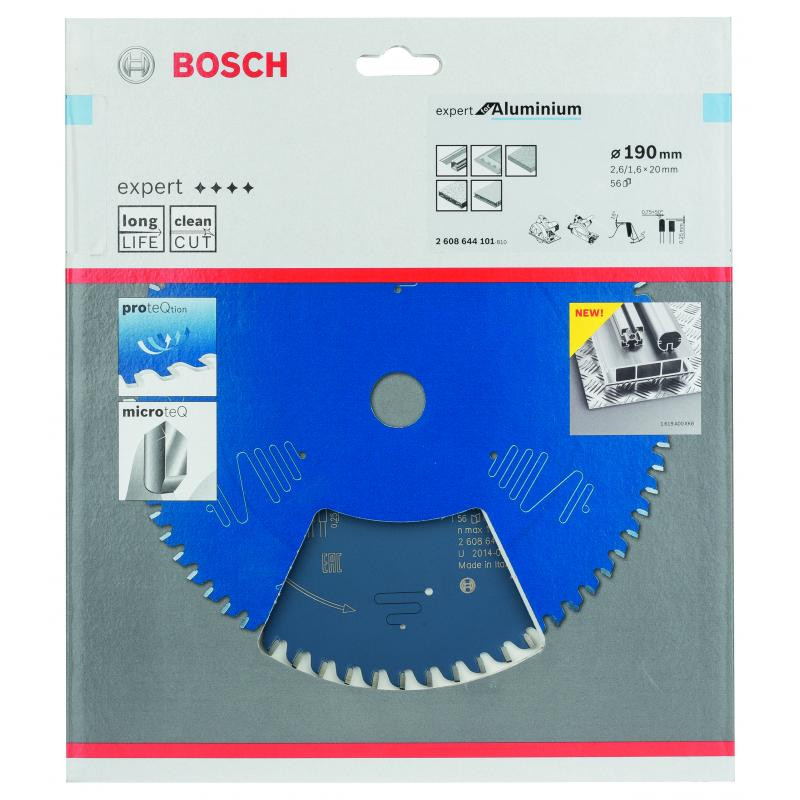 Emballage: 1Marque: BoschRéférence: 2608644101EAN: 3165140796675Description: Lame de Scie Circulaire Expert pour Aluminium, 190 x 20 x 2,6 mm, 56D