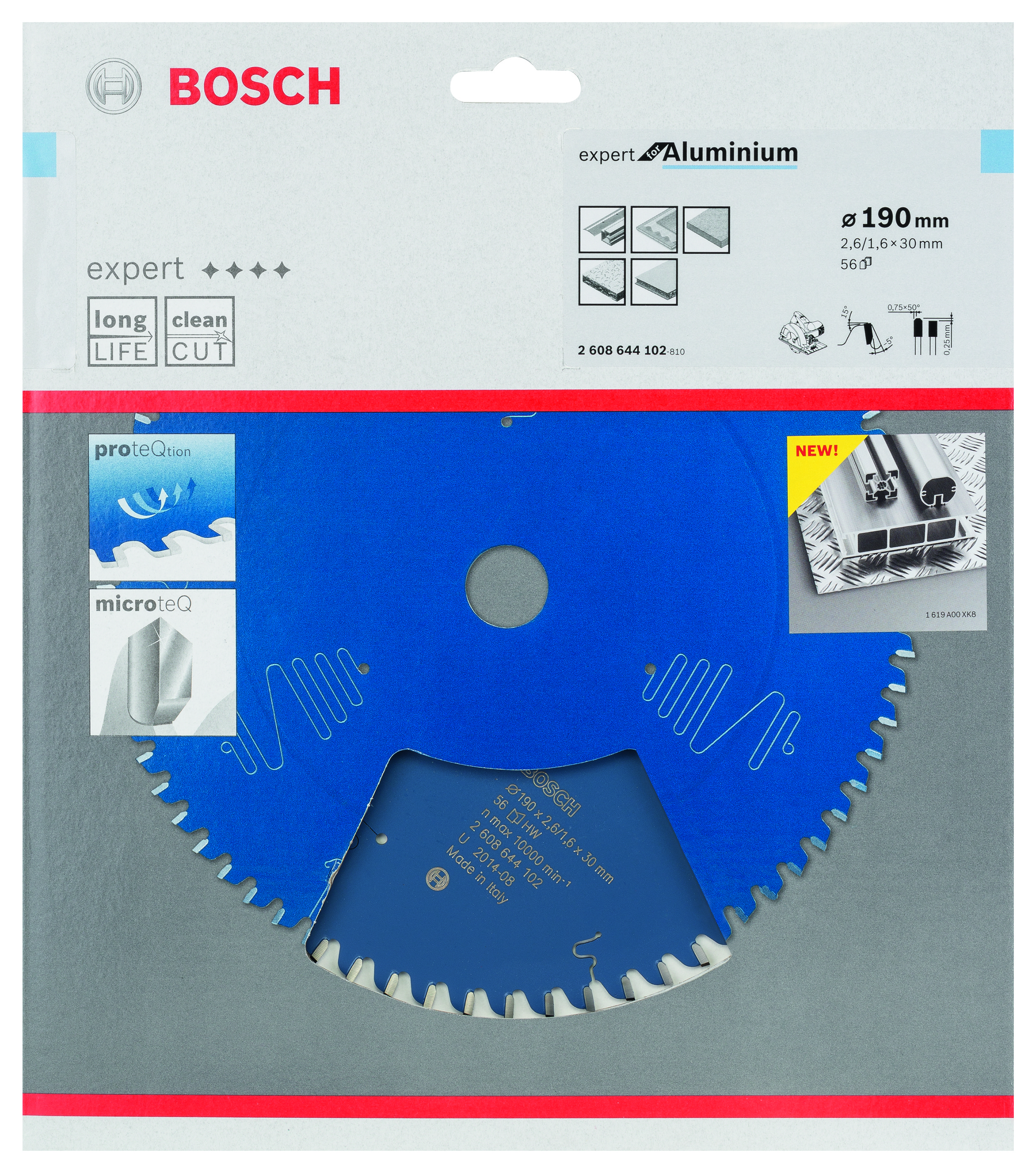 Emballage: 1Marque: BoschRéférence: 2608644102EAN: 3165140796682Description: Lame de Scie Circulaire Expert pour Aluminium, 190 x 30 x 2,6 mm, 56D