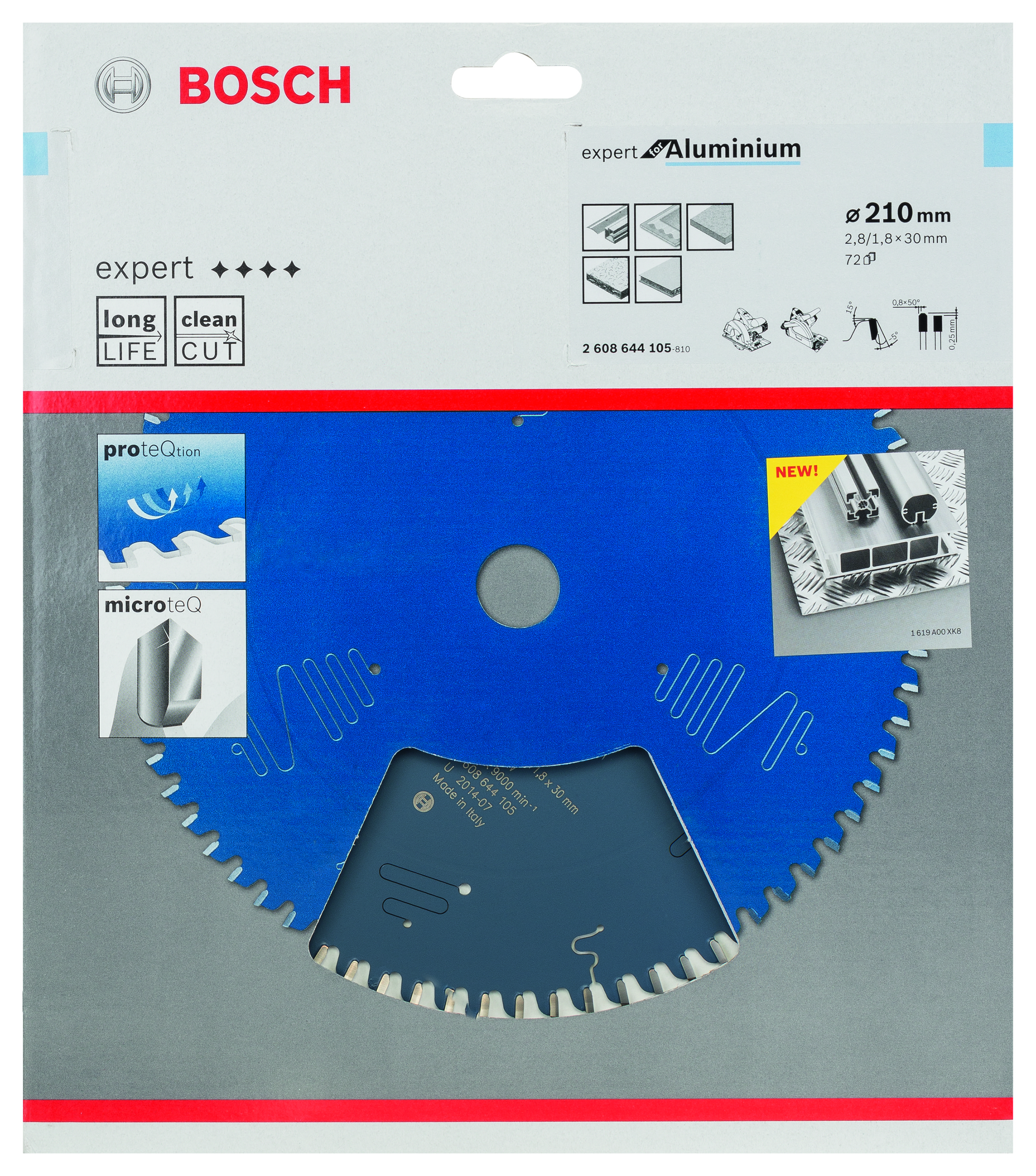 Emballage: 1Marque: BoschRéférence: 2608644105EAN: 3165140796712Description: Lame de Scie Circulaire Expert pour Aluminium, 210 x 30 x 2,8 mm, 72D