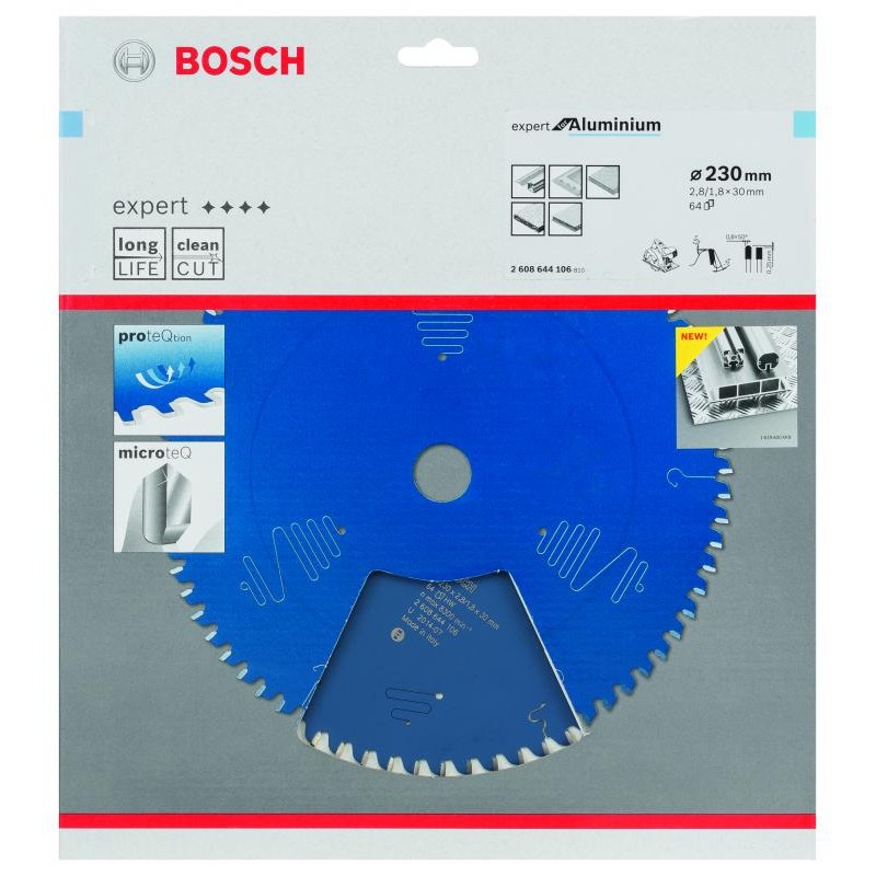 Emballage: 1Marque: BoschRéférence: 2608644106EAN: 3165140796729Description: Lame de Scie Circulaire Expert pour Aluminium, 230 x 30 x 2,8 mm, 64D